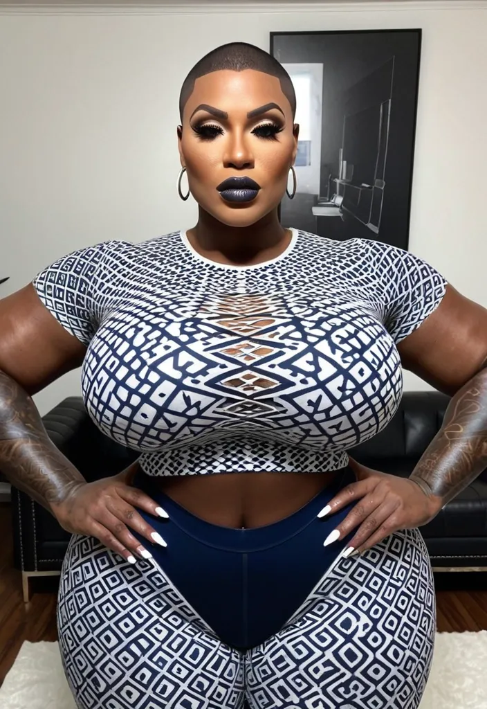 Generate Gorgeous female boss , bimbo , very dark-skinned African-American woman , buzz cut , pixie hair , hourglass body , abnormally massive female bodybuilder , gorgeous , close up , full lips , big booty , dark brown eyes , very big plump lips , feminine silhouette , too big breast , big booty , sexy thighs abs , silhouette , up close , flexing biceps , big gorgeous light brown eyes , legs are iconic and defining physical feature , both visually and in terms of combat ability.wearing an outfit that is a striking blend of elegance , power , and femininity , designed to command attention in any room. The suit is tailored to perfection , hugging the wearer’s curves with precision while emphasizing a structured silhouette. The fabric itself is a refined grey tweed patterned with subtle white grid lines , giving the suit a texture that feels both sophisticated and modern. The blazer features broad blue lapels and gold button accents , adding a luxurious touch that elevates the look beyond typical business attire. The matching high-waisted trousers elongate the frame , further enhancing the poised and commanding effect of the ensemble.The styling choices amplify the boldness of the suit. The inner blouse is a silky , greybutton-down shirt that complements the tweed’s tone while introducing a softer , feminine balance to the sharp tailoring of the jacket. The blouse peeks out neatly from under the blazer , maintaining elegance without drawing focus away from the suit’s commanding cut. Accessories are kept minimal yet intentional: a delicate layered gold necklace and hoop earrings that add glimmers of light and luxury without overpowering the outfit. The choice of voluminous , honey-brown braids cascading down her shoulders frames the face with both confidence and glamour , completing the commanding visual.Altogether , this look communicates a blend of authority and allure. It is business-ready yet fashion-forward , balancing corporate structure with vibrant femininity. The color palette blue , grey and gold avoids being overly delicate , instead embracing the richness of texture , structure , and presence. This is the kind of ensemble that speaks to ambition , sophistication , and personal style—ideal for someone who thrives in positions of influence but insists on expressing her individuality with bold elegance. It’s not just clothing—it’s a statement of power wrapped in grace. In luxury living legs that could crush a watermelon , skirt high boots are a bold and striking statement piece , crafted in glossy black patent leather that gives them a sleek , polished finish. Rising to just below the knee , the boots feature three adjustable buckle straps along the shaft , adding both edge and detail to their design. The towering stiletto heel , paired with a thick platform sole , creates an ultra-dramatic silhouette that elongates the leg and exudes power and confidence. With their combination of shine , height , and structure , these boots perfectly balance fierce femininity with high-fashion allure. Massive breast , massive cleavage , driving and standing in living room , wearing a white , dark navy blue and black accented subtle symmetrical patterned t-shirt , massive cleavage , black thong , enormous butt ,