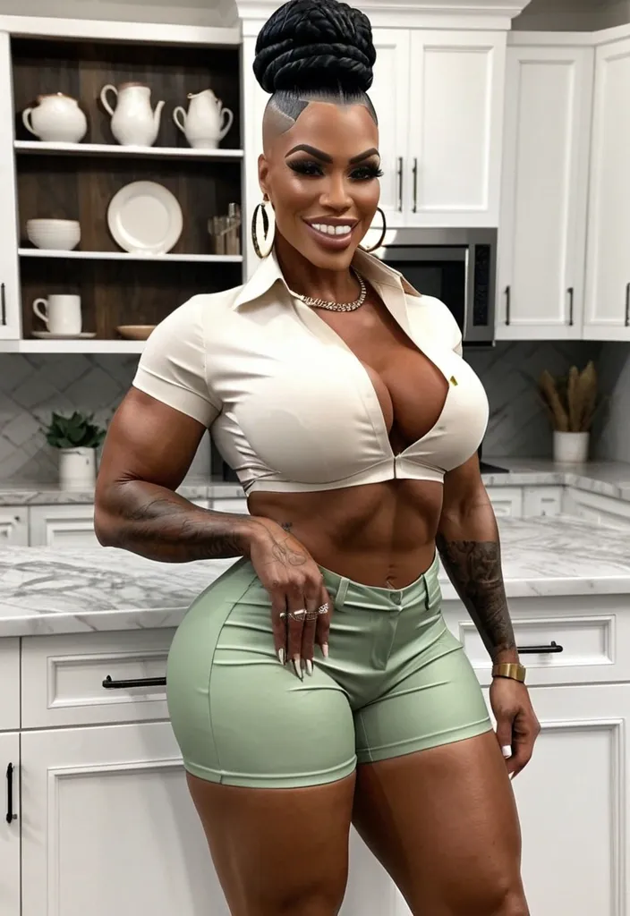 Generate a dark-skinned African-American woman , gorgeous female boss , bimbo , hourglass body , abnormally massive female bodybuilder , gorgeous , close up , full lips , big booty , black hair , braided-style-mohawk that she wears bald on the side , feminine silhouette , too big breast , big booty , sexy thighs abs , silhouette , up close , flexing biceps , beautiful light hazel eyes , legs are iconic and defining physical feature , both visually and in terms of combat ability.wearing an outfit that is a striking blend of elegance , power , and femininity , designed to command attention in any room. outfit in this image is a modern , giving it both structure and a touch of relaxed style. highlighting her curves while keeping the look balanced and versatile. Its neutral tone contrasts nicely against the blue denim , keeping the ensemble cohesive without overpowering the statement of the.Completing the polished and fashionable. Together , the outfit blends everyday comfort with bold , confident styling. This is the kind of ensemble that speaks to ambition , sophistication , and personal style—ideal for someone who thrives in positions of influence but insists on expressing her individuality with bold elegance. It’s not just clothing—it’s a statement of power wrapped in grace , Massive cleavage thunder thighs , enormous butt , muscular legs , hazel eyes , Her outfit gives off classy , soft , feminine elegance with that old-school traditionally ladylike vibe — but modernized just enough to feel fresh. The cream button-up modest crop top is polished and refined with those gold emblem buttons — that’s a subtle high-value touch without screaming for attention. The sheer/light fabric looks airy and comfortable for daylight wear , and the pearl necklace and earrings lock that timeless feminine grace into place. She looks like she understands that simple well coordinated usually beats loud and chaotic any day.Her tan high-waist trousers balance her top perfectly. They’re modest , smooth , tailored enough to keep things classy , and the matching gold button ties the whole look together so it doesn’t feel like two random pieces. She looks feminine and fashionable without abandoning tradition — like the kind of woman grandma would nod at and say “yes… that’s how a lady dresses for daytime in herb kitchen .” It respects the past while still letting her express her youth and confidence.This is the type of outfit you could wear walking downtown shops , brunch , meeting family , or even a quiet afternoon date. There is softness , poise , refinement , and a little playful confidence in her smile. It’s modest but flattering , and it’s intentional. She looks like she takes pride in presenting herself well — not to impress everyone — but because she values dignity , grace , and showing up in the world looking put together. Modest top modest top , closed collar top , beige , green and gold , enormous breast , high rise shorts enormous butt , bl in a luxurious kitchen ,