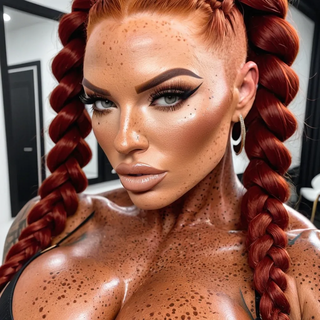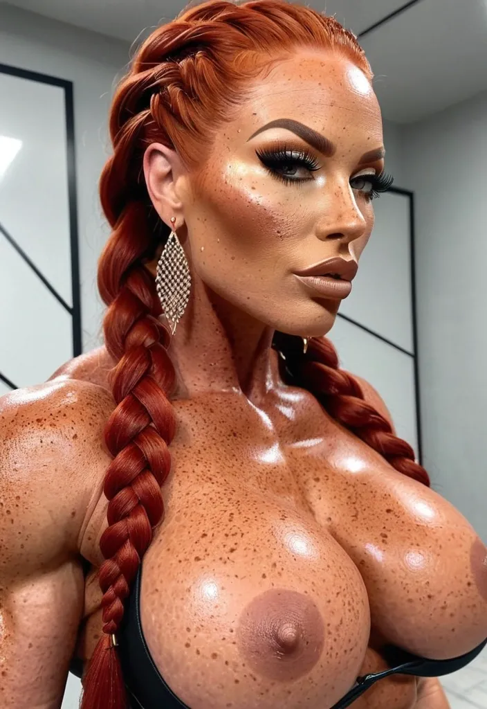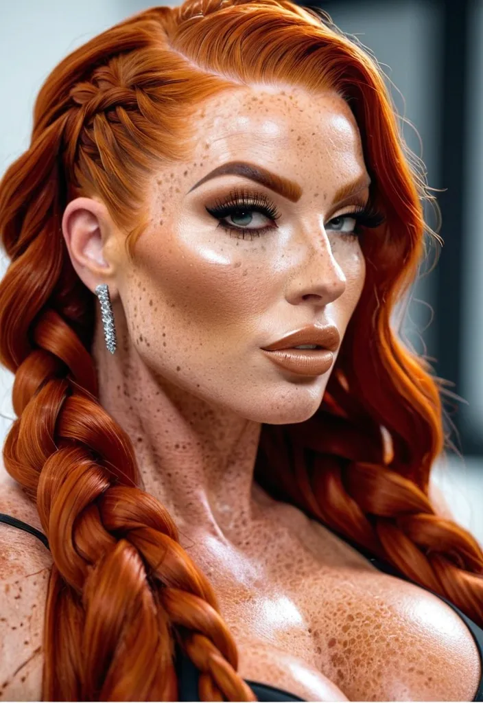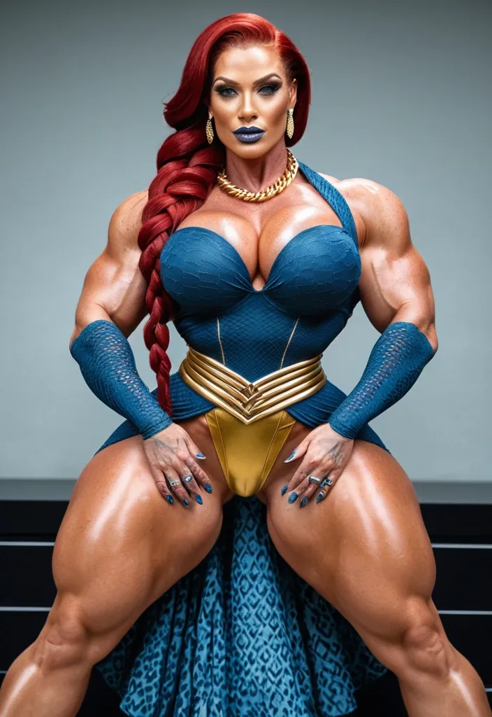 Generate Gorgeous female boss , bimbo , hourglass body , abnormally massive female bodybuilder , gorgeous , close up , full lips , big booty , redheaded , freckles on face and breast , braided design hair , feminine silhouette , too big breast , big booty , sexy thighs abs , silhouette , up close , flexing biceps , beautiful green eyes , legs are iconic and defining physical feature , both visually and in terms of combat ability.wearing an outfit that is a striking blend of elegance , power , and femininity , designed to command attention in any room. The suit is tailored to perfection , hugging the wearer’s curves with precision while emphasizing a structured silhouette. The fabric itself is a refined grey tweed patterned with subtle white grid lines , giving the suit a texture that feels both sophisticated and modern. The blazer features broad blue lapels and gold button accents , adding a luxurious touch that elevates the look beyond typical business attire. The matching high-waisted trousers elongate the frame , further enhancing the poised and commanding effect of the ensemble.The styling choices amplify the boldness of the suit. The inner blouse is a silky , greybutton-down shirt that complements the tweed’s tone while introducing a softer , feminine balance to the sharp tailoring of the jacket. The blouse peeks out neatly from under the blazer , maintaining elegance without drawing focus away from the suit’s commanding cut. Accessories are kept minimal yet intentional: a delicate layered gold necklace and hoop earrings that add glimmers of light and luxury without overpowering the outfit. The choice of voluminous , honey-brown braids cascading down her shoulders frames the face with both confidence and glamour , completing the commanding visual.Altogether , this look communicates a blend of authority and allure. It is business-ready yet fashion-forward , balancing corporate structure with vibrant femininity. The color palette blue , grey and gold avoids being overly delicate , instead embracing the richness of texture , structure , and presence. This is the kind of ensemble that speaks to ambition , sophistication , and personal style—ideal for someone who thrives in positions of influence but insists on expressing her individuality with bold elegance. It’s not just clothing—it’s a statement of power wrapped in grace. In luxury living legs that could crush a watermelon , skirt high boots are a bold and striking statement piece , crafted in glossy black patent leather that gives them a sleek , polished finish. Rising to just below the knee , the boots feature three adjustable buckle straps along the shaft , adding both edge and detail to their design. The towering stiletto heel , paired with a thick platform sole , creates an ultra-dramatic silhouette that elongates the leg and exudes power and confidence. With their combination of shine , height , and structure , these boots perfectly balance fierce femininity with high-fashion allure. ,