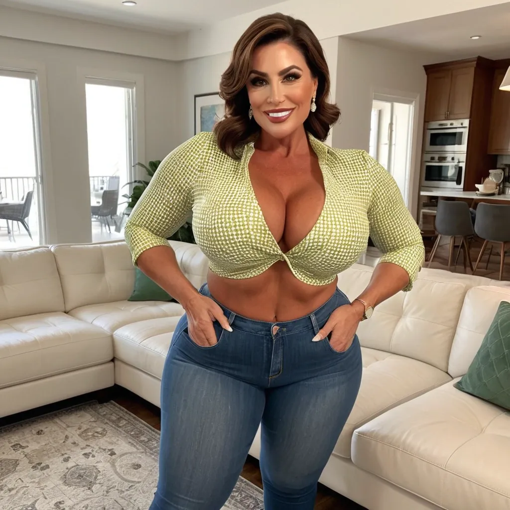 The Caucasian woman in this image embodies the warm , 24 year old. Massive cleavage , enormous breast , wide hips , small waist , big butt thick thighs and legs , inviting presence often associated with a classic housewife , but with a modern touch. Her soft features , glowing skin , beautifully brown eyes , and short , styled brown hair give her a polished yet approachable look. She wears a gentle smile that conveys friendliness and comfort , the kind of expression that makes a home feel welcoming. Her light brown eyes shimmer with warmth , reflecting both confidence and an easygoing charm.Her outfit—a form-fitting white and lime green accented blouse paired with blue jeans—suggests practicality while also highlighting her elegance. The blouse , slightly low-cut , adds a feminine flair , while the fitted denim anchors her look in casual , everyday domestic life. Together , her clothing and posture suggest she is comfortable in her skin and enjoys presenting herself with a balance of poise and relatability. The attire is both flattering and functional , signaling someone who moves easily between household duties and social warmth.The background , tidy cozy living room as she sits on a comfortable living room light beige leather sofa , The environment frames her as someone who not only manages her household with grace but also takes pride in the details that create a sense of family and belonging. Overall , she radiates the energy of a woman who is strong , beautiful , and grounded in her role , balancing sophistication with the cozy atmosphere of home life. Hourglass body , enormous breast , enormous butt , powerful hourglass silhouettet thunder , thighs , and hips massive breast ,