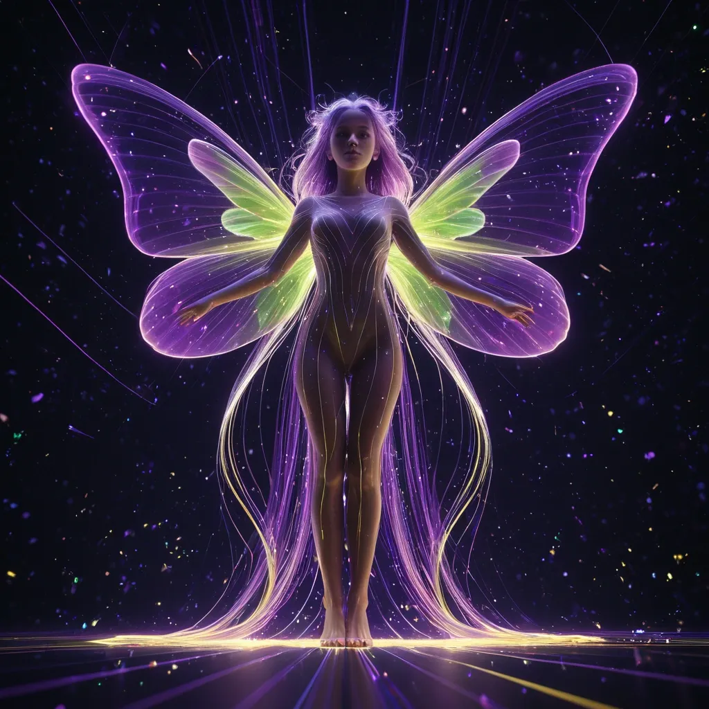 Butterfly rendered as an Anamorphic Perspective Distortion , appearing distorted from most angles but resolving into a clear image from a specific viewpoint. Use violet and chartreuse to accentuate the warped elements. Style: Celestial , ethereal , abstract , digital art Lighting: Dramatic backlighting , bright glowing particles , contrasting dark background Composition: Full body shot , dynamic diagonal composition , upward gaze Details: Sparkling hair and garment , streaking colorful light trails , sense of movement and wonder , magical atmosphere Quality: High detail , 4K , Masterpiece , Rendered in Octane ,