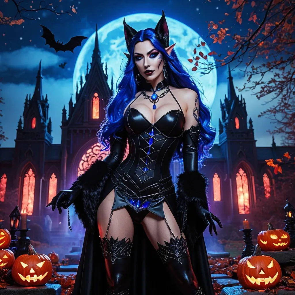 A breathtaking character with tattoos and makeup augmenting portrait set against a dramatic twilight sky , with vibrant hues of blue and deep purple , illuminated by a glowing sunset. A beauty woman as a batwoman depicted in a sleek , form-fitting black cat cosplay costume with fur and laces , a miniskirt with chains and elven decorated (style:1.2) , enriched by a white fur trim and a striking blue gem pendant. Her long , flowing hair cascades down , capturing the wind's movement , with strands glowing softly in the low light , she lie son a fluffy beautiful blanket near ba a black cat and a halloween pumpkin with candle , other candlelight around , The focus should be on the elegant pose and the intricate details in the costume and accessories. The background is a elven temple , includes halloween decorations and moonlight beams , die colorsare deep blue and bright red , fog and roses Include autumn leaves , . The composition emphasizes the character in the foreground , balancing negative space to enhance the visual impact of the subject. The lighting should appear natural yet slightly enhanced , emphasizing depth and dimension , with shadows adding drama (lighting:1.2). Use an anime-inspired style for an engaging visual effect , with influences from renowned artists in this genre. Ideal for a digital illustration , excluding realism. Prompts by Follwerine ,