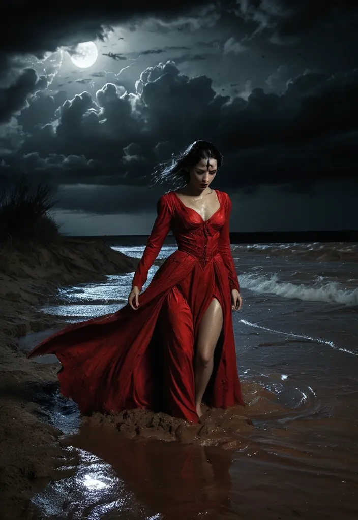 A woman in a flowing red dress sinking into quicksand , with a mysterious hitman watching from a distance under a stormy , moonlit sky. The scene evokes themes of dangerous love and inevitable fate , rendered in a dark romanticism style , inspired by the dramatic chiaroscuro of Caravaggio and the surreal , symbolic compositions of Remedios Varo. Vivid , contrasting colors and dramatic lighting create a sense of tension and foreboding. ar-9:16 ,