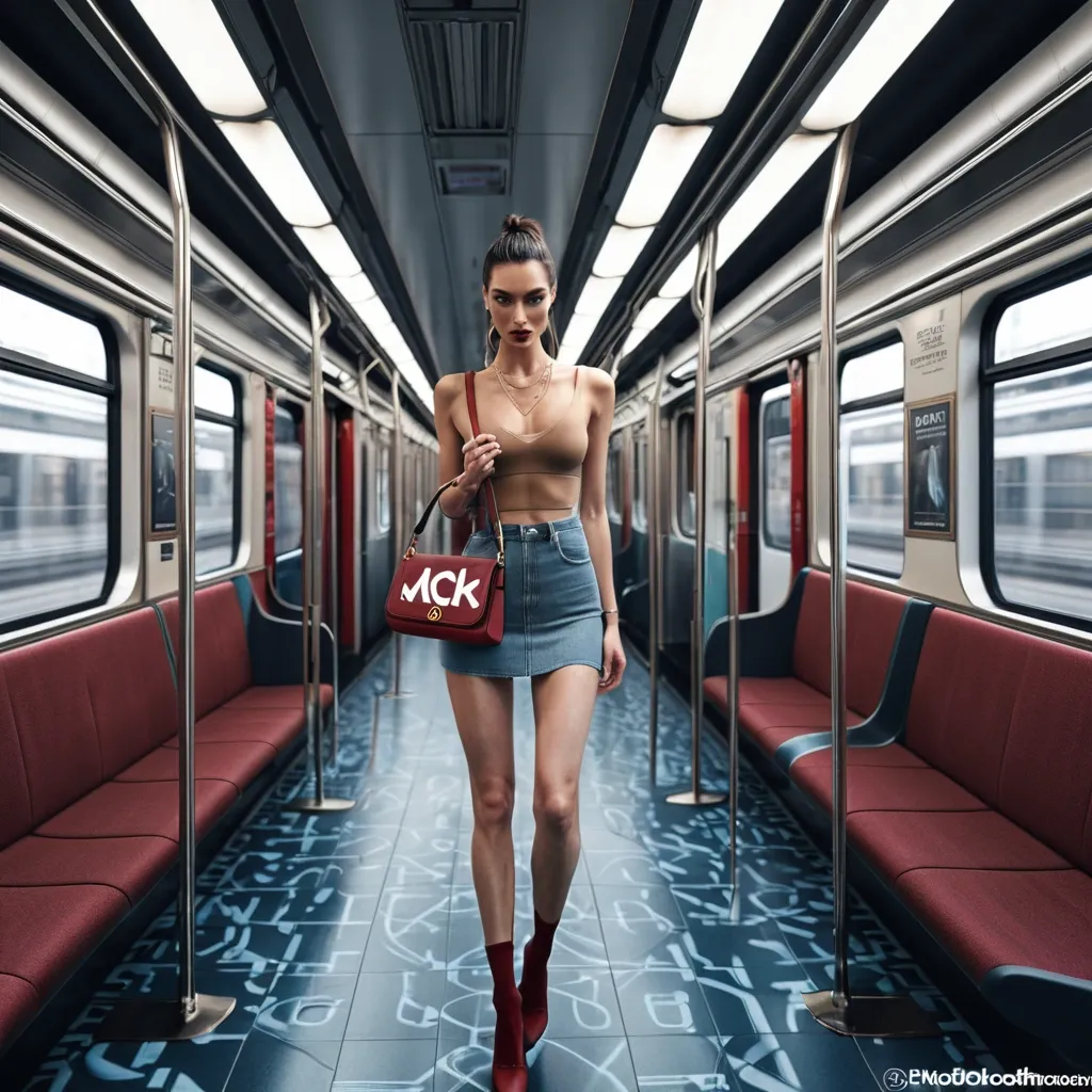 Hyper photo-realistic candid lifestyle fashion photo inside a modern commuter train carriage. A young white woman (early 20s) , slim/curvy build , light-medium warm skin tone , sitting alone across a blue patterned fabric bench seat. Pose: relaxed “boss” posture with both arms stretched wide along the backrest , legs crossed (right leg over left) , torso turned slightly left , head turned left looking out the window. Outfit: tight white cropped AC Milan football tee with printed text “KEM CHOO?” and small adidas logo + club crest , tan/beige trench coat/jacket draped over her lap , white crew socks , tan chunky lace-up loafers/boat shoes. Accessories: oversized beige/cream over-ear headphones , small oval black sunglasses , gold hoop earrings , thin gold necklace , small shoulder bag with brown monogram pattern tucked under her arm. Hair: dark brown , high ponytail with loose face-framing strands. Setting: train interior with red door frame on right edge , ventilation grille above window , blue mosaic seat fabric , dark floor. Window shows fast motion blur of passing train/platform in red/pink tones. Lighting: soft daylight from window , natural skin texture , iPhone video-frame look. Composition: full body head-to-toe centered , subject fills ~70% of frame height , vertical 9:16 aspect , eye-level camera from across the aisle , 24–28mm wide lens look , sharp focus on subject with background slightly softer , photorealistic real human. Negative prompt: cartoon , CGI , airbrushed skin , extra limbs , bad hands , cropped feet , cropped head , text misspelled , warped logos , blurry subject , watermark , oversaturated HDR ,