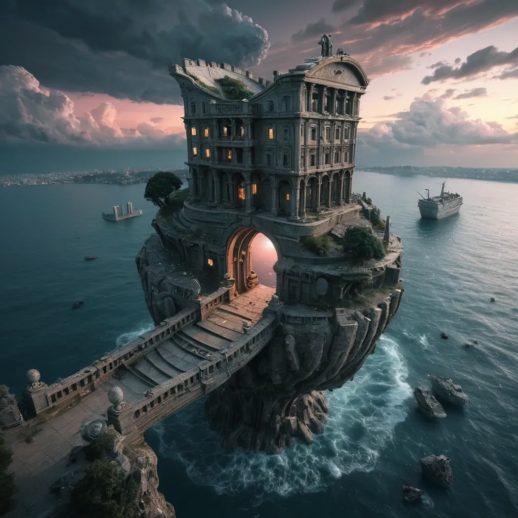 Bird's eye view , view from top , a Giant Ship shaped like a half-3D earth. A statues caryatids fit men hold a building construction , concrete brutality buildings abandoned , lost dystopi city , and bridges connecting disjointed structures that floating on middle of ocean. A winding stone staircase leads from the seaside , water , in waves to an open doorway , inviting viewers into the house. The landscape is illuminated by soft , ethereal light from a distant moon , casting a dreamy glow over the scene. The sky is rich with dark , brooding clouds , interspersed with bursts of soft pastel colors , suggesting the moments before sunset. A solitary tree leans against the structure , adding an organic touch among the surreal elements. ,