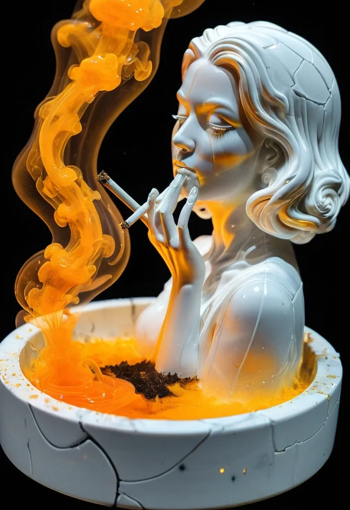create silky porcelain ice cube A close-up double exposure of a 420 portal into the City of Atlanta landscaping blending in the glowing in the joint in an ashtray , cigarette smoke forming the dedicate sculpture of an beautiful white woman , it's orange yellow wisps contrasting with the black background , comic Milky Way , 25d rendering , embossed ,