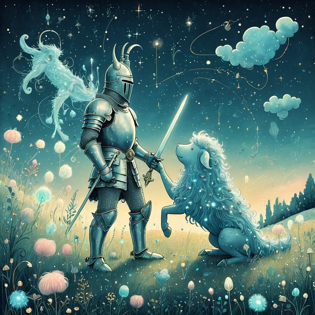 A whimsical scene depicting a knight in shining armor attempting to tame a mischievous , fluffy creature that resembles a cloud made of stardust. They are in a meadow filled with bioluminescent flora , under a sky where constellations form mythical beasts. The illustration style is akin to a vintage storybook , with soft , dreamy colors and a gentle , narrative quality. ,