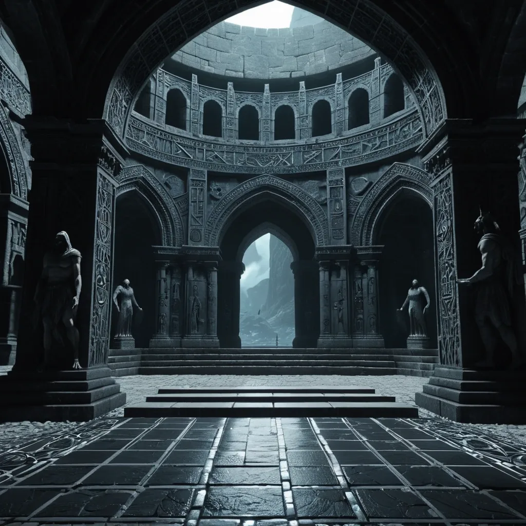 England , 1600 , a crypt dominated by the Arch , a fifteen-foot black monolith with intricate geometric carvings , its frame filled with a shimmering , opaque silver energy like suspended mercury , torchlight swallowed by the stone , shadows pooling on the floor as a few figures cautiously approach , Style: Matte Painting , detailed and atmospheric , Eye-level view , Full scene , 4K ,
