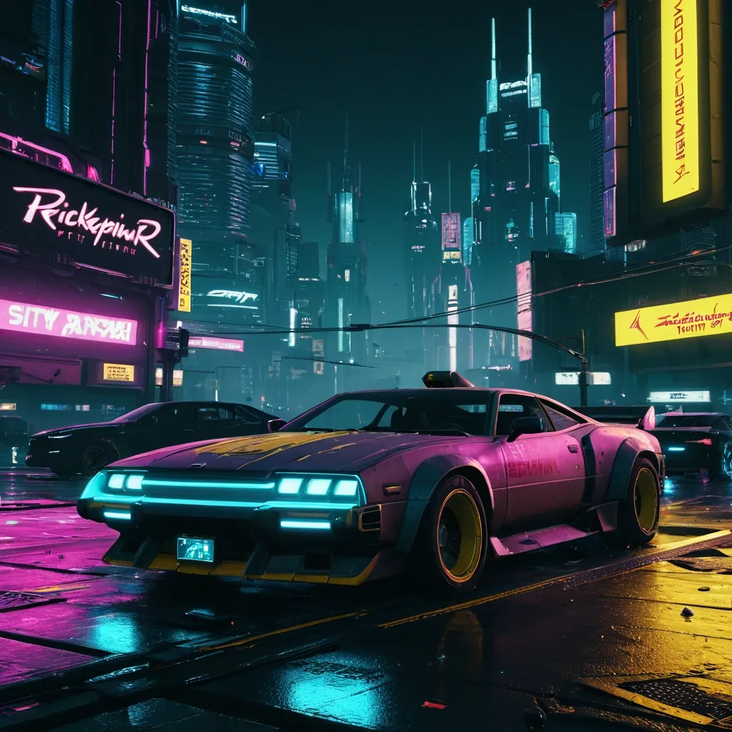 A highly detailed cyberpunk truck hauling a large cargo container , in the style of Cyberpunk 2077 game art , with neon lights , futuristic modifications , chrome accents , and glowing holograms. Isometric top-down angled view like in a real-time strategy game , the truck speeding along a well-lit urban highway at night , surrounded by rainy streets , towering skyscrapers with colorful neon signs , flying drones , and distant city glow. High contrast lighting , volumetric fog , cyberpunk atmosphere , ultra-realistic rendering , 8k resolution , cinematic composition ,