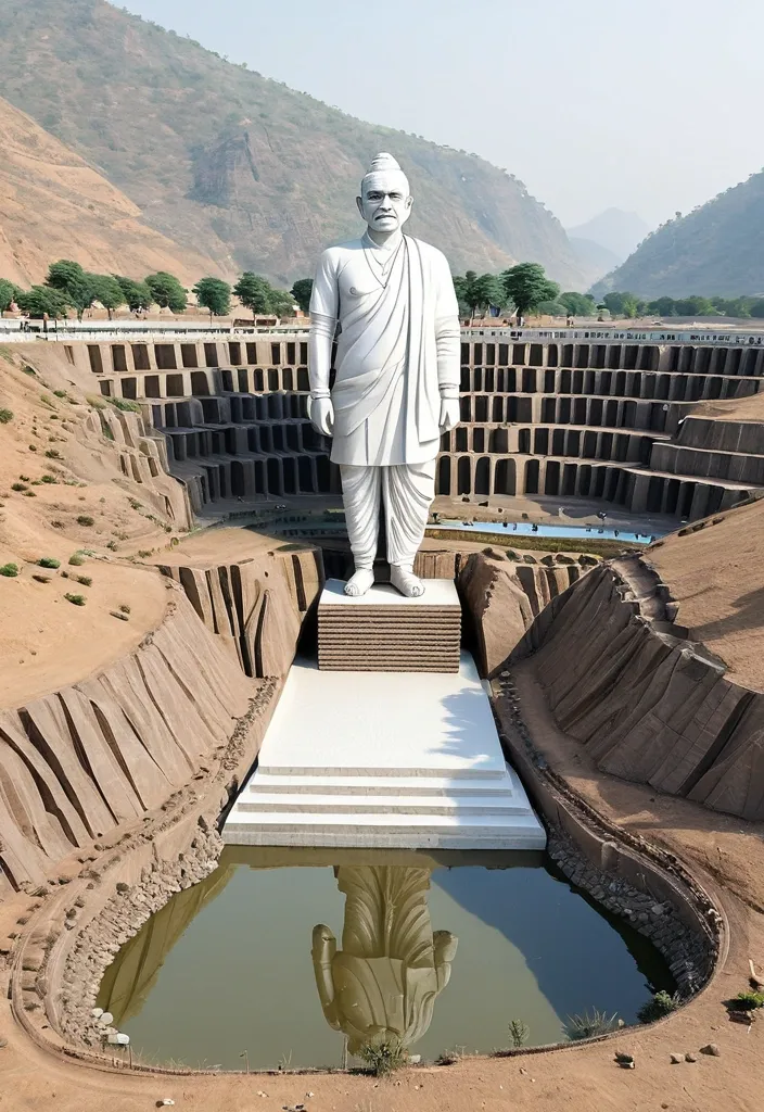 Hyper-realistic 3D square diorama of Narmada valley , near Kevadia in the state of Gujarat , India , carved out with exposed soil cross-section beneath showing rocks , roots , and earth layers. Above: whimsical a dam over Narmada river between mountains , and Statue of Unity is the world's tallest statue (Indian politician and independence activist Sardar Patel). Modern white “Statue Of Unity” label integrated naturally. Pure white studio background with soft natural lighting. DSLR photograph quality - crisp , vibrant , magical realism style. ,