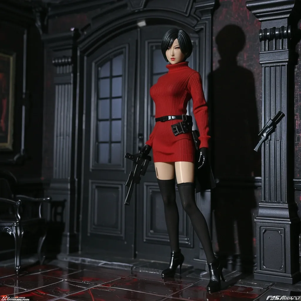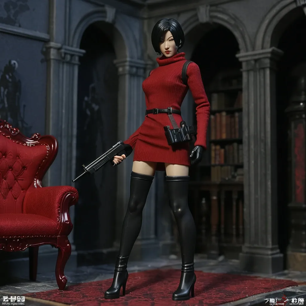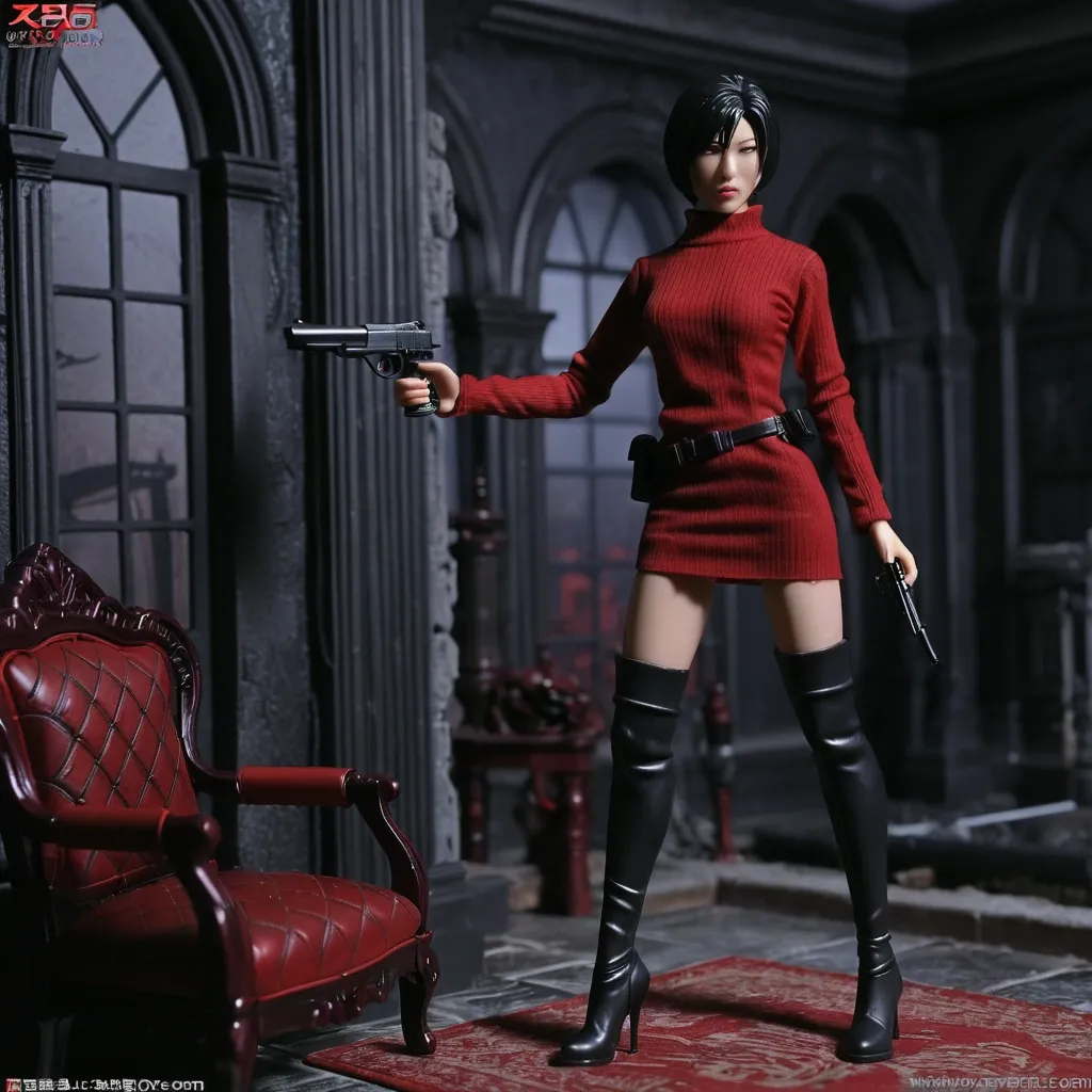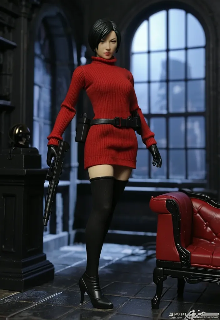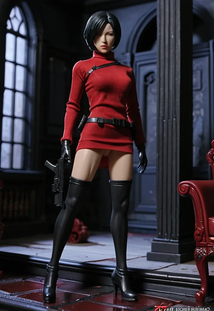 A poised woman with sharp , dark eyes and deep red lipstick stands with her back to a floor-to-ceiling window overlooking a futuristic cityscape of towering , blade-like skyscrapers shrouded in twilight haze. Her sleek brown hair is pulled into a low , elegant bun , and a small beige beret sits tilted atop her head , complementing the form-fitting , long-sleeved beige dress that hugs her hourglass figure with subtle geometric paneling.The dress features a high mandarin collar and a pencil skirt that ends just below the knee , accentuating her curves while maintaining a sophisticated , militaristic edge. In her right hand , she casually holds a sleek black-and-silver pistol behind her back , her posture confident and commanding as the city lights begin to flicker on in the background. big brown strikingly strikingly light reflecting dark-brown eyes , enormous butt , enormous butt , powerful hips. abs abnormally massive female bodybuilder , gorgeous , massive , too big breast , powerful hourglass silhouette , big booty ,