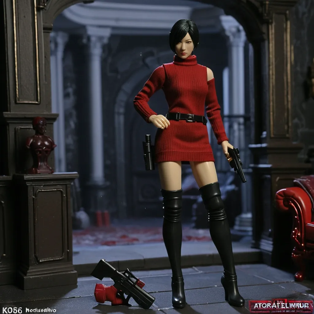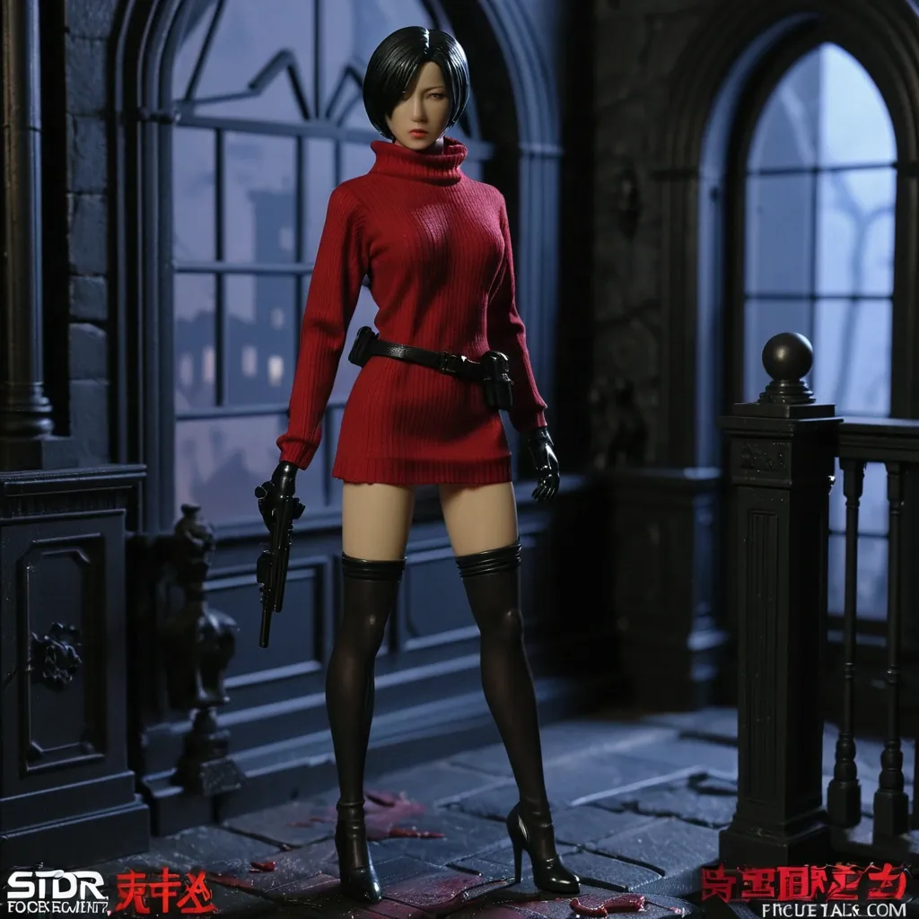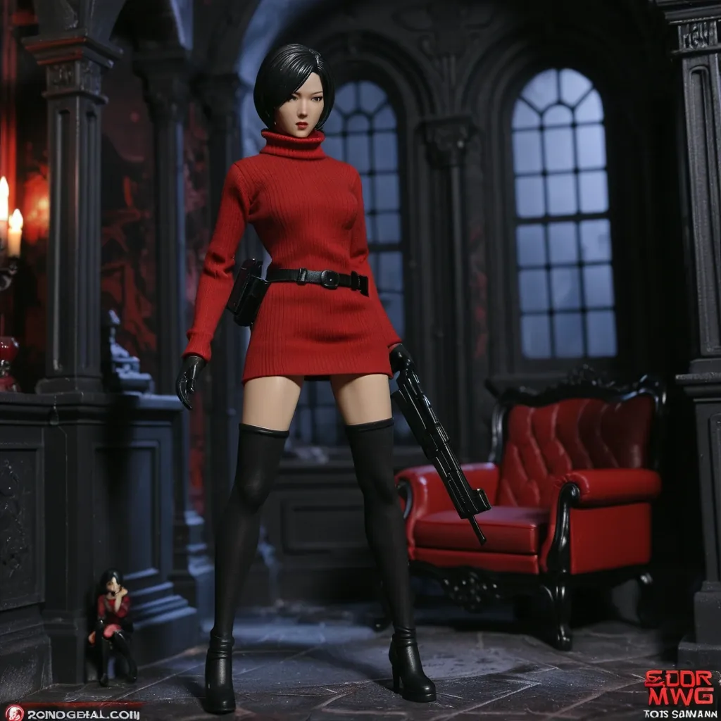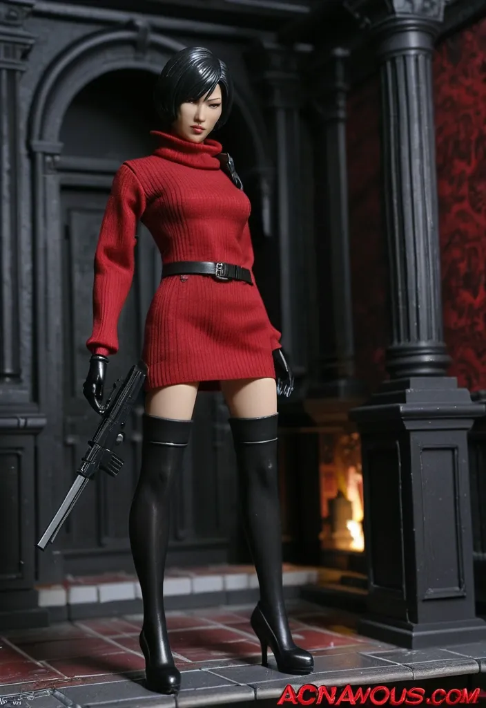 A poised woman with sharp , dark eyes and deep red lipstick stands with her back to a floor-to-ceiling window overlooking a futuristic cityscape of towering , blade-like skyscrapers shrouded in twilight haze. Her sleek brown hair is pulled into a low , elegant bun , and a small beige beret sits tilted atop her head , complementing the form-fitting , long-sleeved beige dress that hugs her hourglass figure with subtle geometric paneling.The dress features a high mandarin collar and a pencil skirt that ends just below the knee , accentuating her curves while maintaining a sophisticated , militaristic edge. In her right hand , she casually holds a sleek black-and-silver pistol behind her back , her posture confident and commanding as the city lights begin to flicker on in the background. big brown strikingly strikingly light reflecting dark-brown eyes , enormous butt , enormous butt , powerful hips. abs abnormally massive female bodybuilder , gorgeous , massive , too big breast , powerful hourglass silhouette , big booty ,