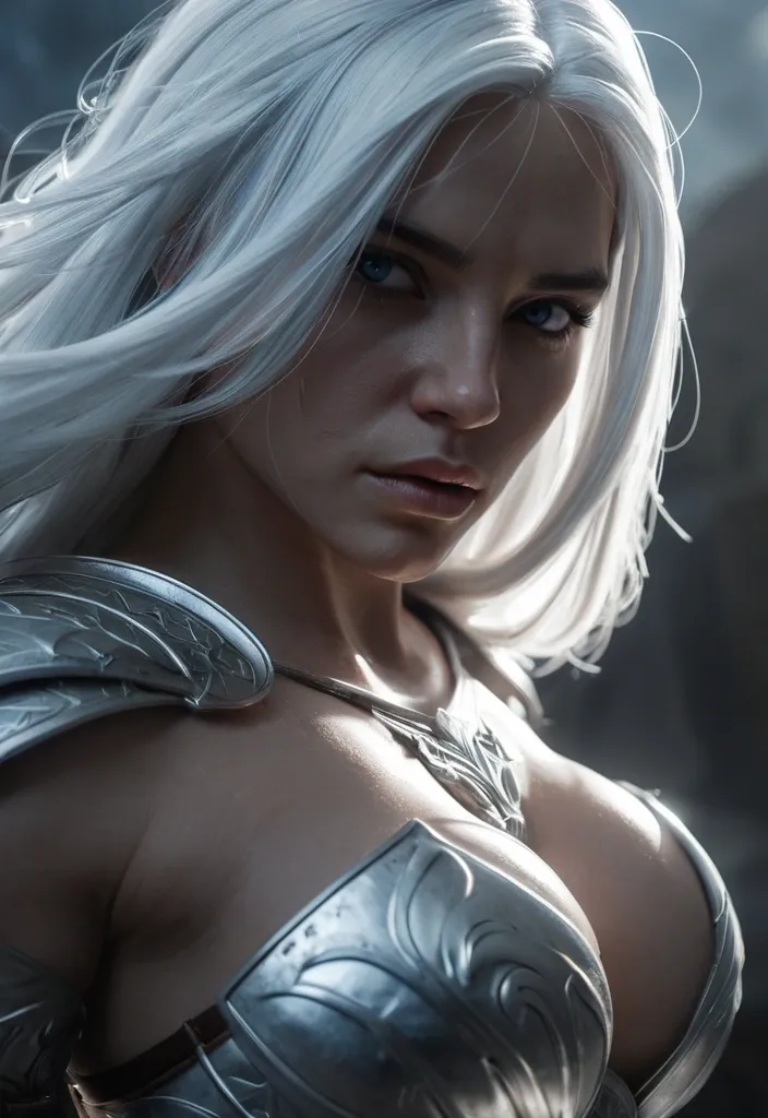masterpiece: best quality , Venezuelan female warrior (adult) , flowing white hair , blue eyes , low angle shot , cinematic backlight , cold silver tones with warm warm rim highlights , photorealistic , ultra detailed --ar 3:4 --q 2 --stylize 50 --no minors --no explicit nudity --no blurry faces --no extra fingers ,