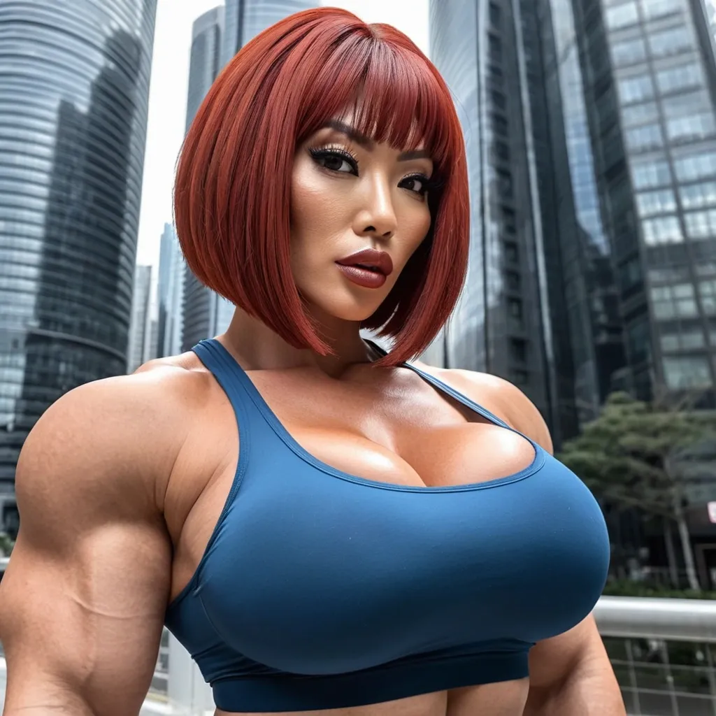 Generate Gorgeous female boss , bimbo , hourglass body , Japanese woman , abnormally massive female bodybuilder , gorgeous , close up , full lips , big booty , red hair , short bob-cut hair , , feminine silhouette , too big breast , big booty , sexy thighs abs , silhouette , up close , flexing biceps , beautiful brown eyes , legs are iconic and defining physical feature , both visually and in terms of combat ability.wearing an outfit that is a striking blend of elegance , power , and femininity , designed to command attention in any room. Outfit tailored to perfection , hugging the wearer’s curves with precision while emphasizing a structured silhouette. The fabric texture that feels both sophisticated and modern. The tank top features a luxurious touch that elevates the look beyond typical attire. The matching high-waisted shorts elongate the frame , further enhancing the poised and commanding effect of the ensemble.The styling choices amplify the boldness of the outfit. The outfit complements the tweed’s tone while introducing a softer , feminine balance to the sharp tailoring of the outfit. She is maintaining elegance without drawing focus away from the outfit commanding cut. Accessories are kept minimal yet intentional: a delicate layered gold necklace and hoop earrings that add glimmers of light and luxury without overpowering the outfit. The choice of voluminous , short bob-cut hair cascading down to her shoulders frames the face with both confidence and glamour , completing the commanding visual.Altogether , this look communicates a blend of authority and allure. It is fashion-forward , balancing corporate structure with vibrant femininity. The color palette blue tank top and grey short avoids being overly delicate , instead embracing the richness of texture , structure , and presence. This is the kind of ensemble that speaks to ambition , sophistication , and personal style—ideal for someone who thrives in positions of influence but insists on expressing her individuality with bold elegance. It’s not just clothing—it’s a statement of power wrapped in grace. In luxury living legs that could crush a cement block , she has a bold and striking statement piece , her big lips heart shaped lips in glossy red that gives them a sleek , polished finish. Adding both edge and detail to their design. The towering stiletto heel , paired with a thick platform sole , creates an ultra-dramatic silhouette that elongates the leg and exudes power and confidence. With their combination of shine , height , and structure , these boots perfectly balance fierce femininity with high-fashion allure. High cheekbones , prominent jawline , gorgeous big brown eyes , enormous breast , blue tank top , high rise grey short , enormous butt ,