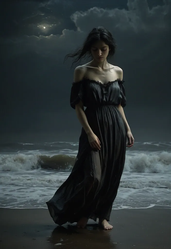 A melancholic woman with dishevelled dark hair and weary eyes , in a flowing , off-the-shoulder silk slip dress , stands on a desolate moonlit beach. The crashing waves reflect a deep , introspective mood. Wisps of fog curl around her. Above , a vast , star-filled sky suggests both unreachable dreams and existential loneliness. Her posture conveys a profound sense of longing and sadness. This is rendered in a moody , atmospheric oil painting style , with dramatic chiaroscuro lighting reminiscent of Caravaggio , and the ethereal , dreamlike qualities of Symbolist painters like Odilon Redon and Gustav Klimt , conveying a rich emotional narrative. ,