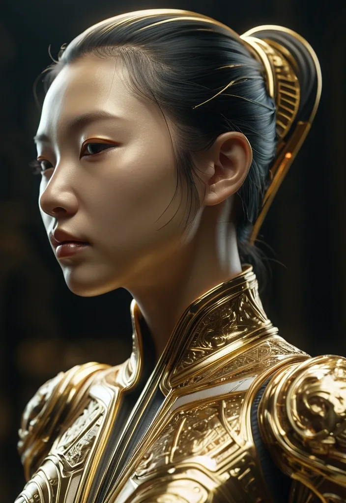 mdjrny-v4 style , symmetrical , intricate , centered 3D render , ultra-detailed beautiful porcelain golden side profile portrait of an Asianwoman , 50mm , beautiful studio soft light , rim light , vivid details , luxurious antique , hyper-realistic , anatomy , facial muscles , Blade Runner atmosphere , elegant , Octane nder , H.R. Giger style , 8k ,
