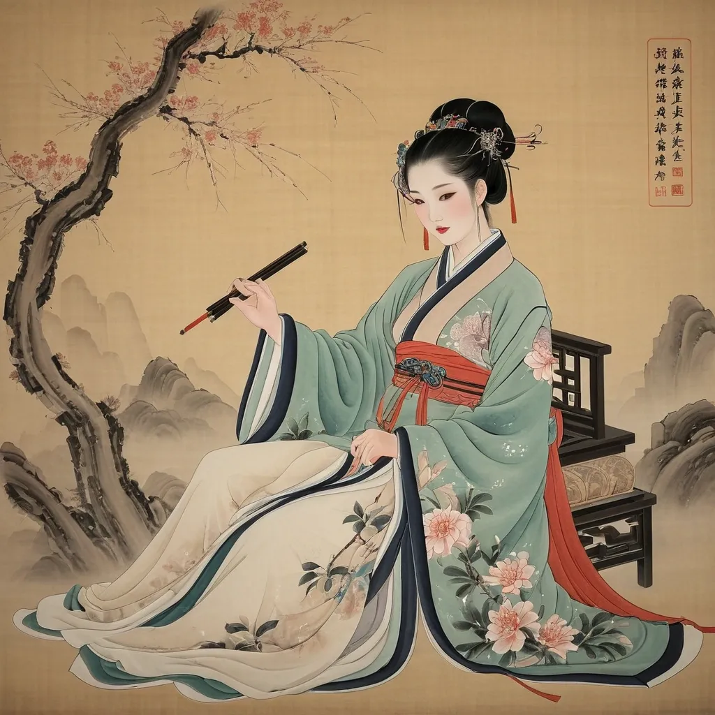A young woman seated on a traditional Japanese wooden bench. The woman , with long , flowing dark brown hair with pink streaks adorned with a pink flower , is dressed in a delicate , semi-transparent purple kimono with large floral patterns , revealing her fair skin and slender , elegant physique , there is a green Land Rover Defender parked on a Cherry blossom Spring field with a tent on top , surrounded by camping gear such as jars , a map , and a picnic basket. the sky is a beautiful sunset with orange and pink hues , creating a warm and inviting atmosphere. ,