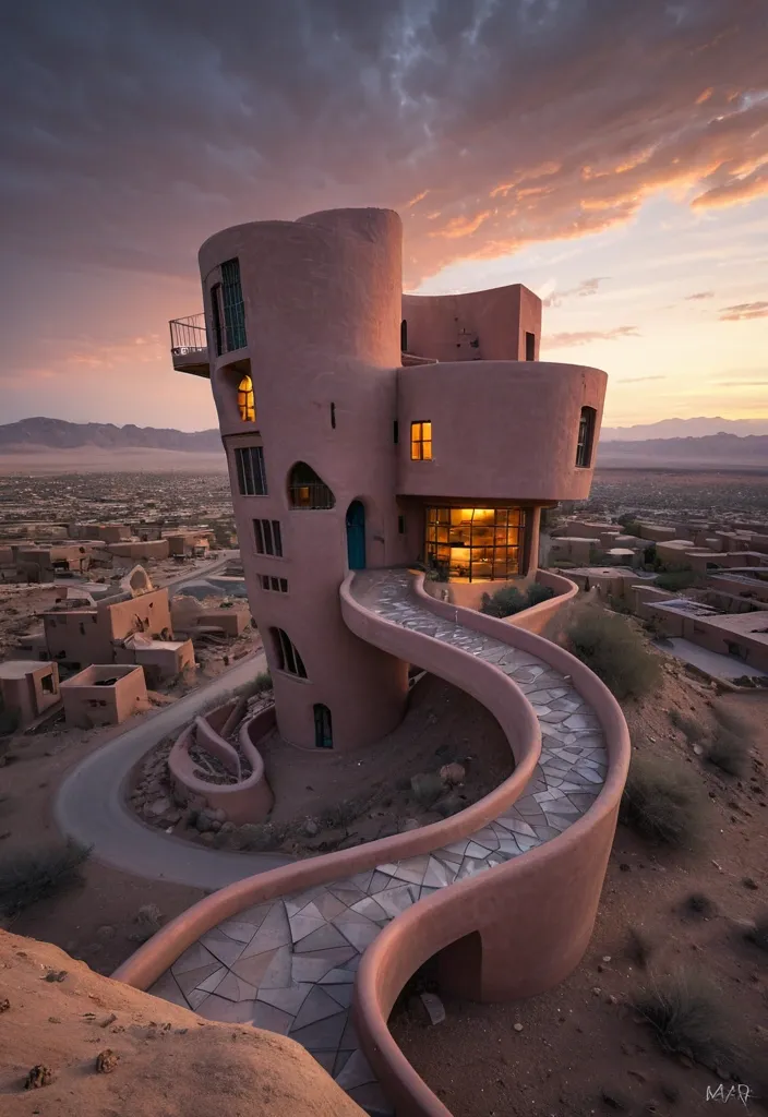 Bird's eye view , view from top , a Giant Wine Glass shaped , inspired by restorunt architecture. A chaotic urban block with twisted geometric forms - skyscrapers bending into impossible angles , roads looping like möbius strips , and bridges connecting disjointed structures on middle of desert. A winding stone staircase leads from the desert to an open doorway , inviting viewers into the house. The landscape is illuminated by soft , ethereal light from a distant moon , casting a dreamy glow over the scene. The sky is rich with dark , brooding clouds , interspersed with bursts of soft pastel colors , suggesting the moments before sunset. A solitary tree leans against the structure , adding an organic touch among the surreal elements. ,