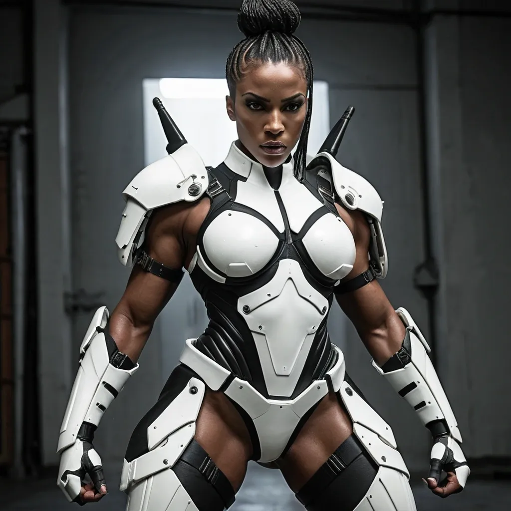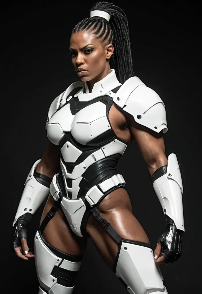 This African-American woman radiates raw strength and commanding presence. Her muscular physique is sculpted to perfection—broad shoulders , powerful arms , hourglass silhouette , and defined curves that prove she is both a warrior and a woman. Her skin glows under the dramatic lighting , emphasizing every contour of her athletic build. She doesn’t just look strong—she looks unstoppable.Her face is fierce and striking , with razor-sharp cheekbones , intense eyes , and lips set in a calm yet deadly expression. Her gaze is focused and predatory , like someone who has seen battle and never backs down. Her hair is styled in intricate natural styled hair tight along the scalp leading into a voluminous bun in the back , with a few locks cascading down for a touch of wild elegance. The hairstyle adds to her intensity while highlighting her regal beauty.She wears a futuristic armored suit in bold pearl white and black , blending sleek sci-fi design with tactical functionality. Metallic shoulder plating and reinforced straps suggest she is built for combat , while the suit contours perfectly to her powerful feminine frame. Every detail of her outfit—high collar , layered textures , gear-like armband—speaks of advanced technology and elite status. She isn’t just a fighter; she is a symbol of power , precision , and unapologetic dominance.enormous butt , enormous breast , thunder thighs , toned legs , powerful hips , bimbo , too big breast , stacked , big round butt , abnormally massive woman , tactical pants , pearl white and black hard leather and armor pants with high boots , muscular legs and powerful hips , Her thighs are incredibly thick , powerful , and densely muscular—built like coiled steel , with the kind of definition that looks strong even when relaxed. Her legs taper into perfectly sculpted calves , giving her the iconic hourglass lower body of a world-class martial arts powerhouse. ,