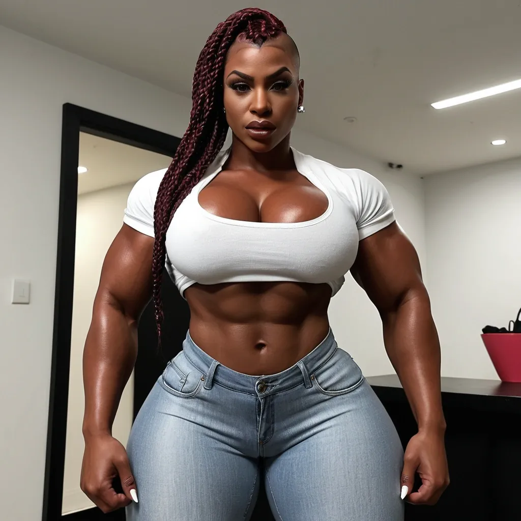 Generate a dark-skinned African-American woman , big lips , gorgeous female boss , bimbo , hourglass body , abnormally massive female bodybuilder , gorgeous , close up , full lips , big booty , black hair , black and burgundy hair , braided-style-mohawk that she wears bald on the side , feminine silhouette , too big breast , big booty , sexy thighs abs , silhouette , up close , flexing biceps , beautiful light hazel eyes , legs are iconic and defining physical feature , both visually and in terms of combat ability.wearing an outfit that is a striking blend of elegance , power , and femininity , designed to command attention in any room. outfit in this image is a modern , giving it both structure and a touch of relaxed style. highlighting her curves while keeping the look balanced and versatile. Its neutral tone contrasts nicely against the blue denim , keeping the ensemble cohesive without overpowering the statement of the.Completing the polished and fashionable. Together , the outfit blends everyday comfort with bold , confident styling. This is the kind of ensemble that speaks to ambition , sophistication , and personal style—ideal for someone who thrives in positions of influence but insists on expressing her individuality with bold elegance. It’s not just clothing—it’s a statement of power wrapped in grace , Massive cleavage thunder thighs , enormous butt , muscular legs , hazel eyes , white t-shirt , gray denim jean ,