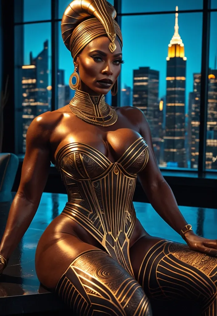 Generate a beautiful African-American woman with jaw-dropping beauty , full lips , face is a study in cinematic intensity. Her skin , rich and dark , glows softly under the interplay of warm golden light and cool neon spilling from the Dream City skyline. High cheekbones cast subtle shadows across her face , while her full lips , poised but unsmiling , suggest a woman who holds her thoughts close and releases them with precision only when needed. Her eyes — wide , deep , dark brown , and unblinking — convey both elegance and a watchful sharpness , the kind of gaze that makes allies feel safe and enemies hesitate. Framing this visage is her towering headwrap , woven from tech-infused copper-gold fabric that glimmers faintly , making her look like both queen and sentinel.Her outfit fuses heritage and futurism in a way only Dream City allows. The off-shoulder bodice , cream-toned and contoured , fits close against her chest , the material reinforced with subtle armored paneling that glints beneath the fabric whenever she shifts. From her waist flows a high-slit skirt of patterned black and bronze , its seams glowing faintly like veins of molten metal. The design pays homage to ancestral African patterns while embedding advanced technology into every stitch. Across her wrists , golden bangles gleam , their engravings concealing the hidden mechanics of Vale-forged microblades. Her hoop earrings , sleek and metallic , hum with encrypted frequencies — adornments that are as functional as they are beautiful.Her body is striking in its balance of power and grace. Broad-shouldered yet feminine , her physique carries the unmistakable presence of someone who has trained , fought , and survived. Her chest is full , her waist narrow , her hips and thighs sculpted with strength — a body built for movement and endurance. Every curve is emphasized by her tailored clothing , not as vanity but as deliberate design , broadcasting confidence and command. She embodies the duality of elegance and lethality: statuesque enough to silence a room , agile enough to dismantle it if required.Around her neck rests a necklace of delicate yet unmistakable significance — a gold chain bearing a small heart emblem. Unlike her other accessories , which serve hidden functions , this piece speaks only of faith and humanity. The heart glimmers softly , catching the noir light with a quiet resonance. It is her anchor , a reminder of love , devotion , and her Christian foundation in a city that thrives on betrayal. While her headwrap and bangles proclaim her readiness for battle , the heart pendant is her whisper of grace , the one vulnerability she keeps in plain sight.The setting frames her as if she were painted into Dream City itself. She sits in a leather chair within the retro-futuristic Vale lounge , its dark woods and metallic trims catching the low glow of lanterns and holographic fixtures. A porcelain-metallic teacup rests in her hand , faintly illuminated by gold tracings in its design , steam rising in delicate curls that mingle with the shadows. Behind her , tall windows reveal the Dream City skyline: spires of glass and steel , their neon veins pulsing blue against the night. The room , the city , and the light all bend toward her presence , making her not merely a figure within Dream City — but one of its pillars , brutal and beautiful , forged to endure. Her thighs are incredibly thick , powerful , and densely muscular—built like coiled steel , with the kind of definition that looks strong even when relaxed. Her legs taper into perfectly sculpted calves , giving her the iconic hourglass lower body of a world-class martial arts powerhouse. ,