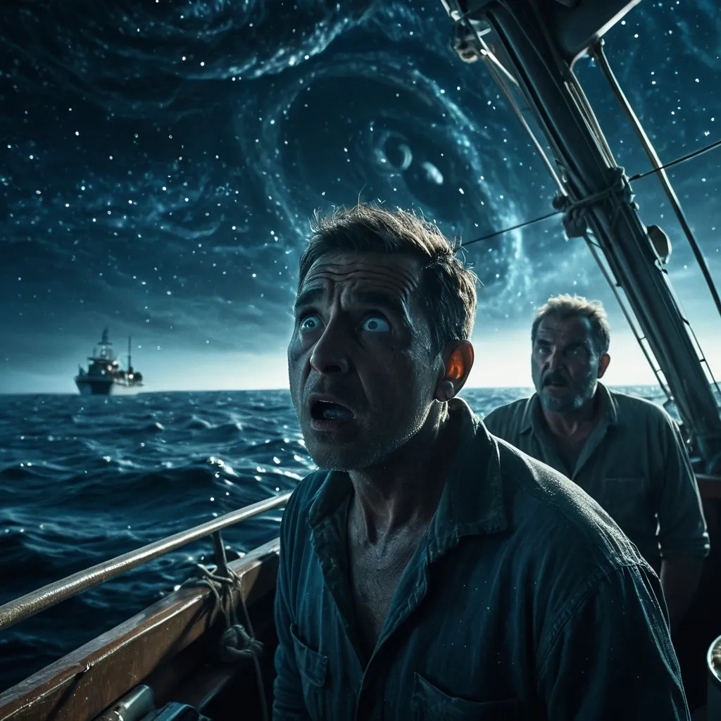 Shocking scene on the deck of the fishing boat , shot from the side , the fishermen looked into the distance with horrified expressions , their eyes widened with fear , and focused tightly on his face. The fisherman's eyes looked around , as if he had witnessed something terrible , above the boat enormous spacecraft like a vortex giant Fossil , blending into the night sky , subtle textures of stardust. The boat swayed gently on the blue sea , and the sea surface sparkled under the sunlight. Movie-level image quality , natural lighting , realistic style , and perfect details. ,