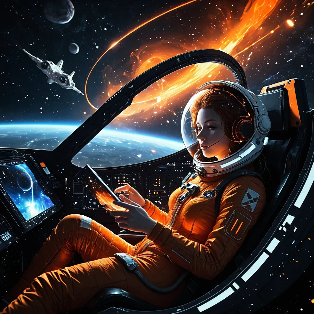 A greatest masterpiece , Dark space , Light and stars are being sucked into a outer space with spacecraft uniquely Orange game remote shaped , a female pilot sitting in the glass cockpit , flying over. Distortion of outer space. Style: Celestial , ethereal , abstract , digital art Lighting: Dramatic backlighting , bright glowing particles , contrasting dark background Composition: dynamic diagonal , composition , upward gaze Details: Sparkling white waves and smoke. ,