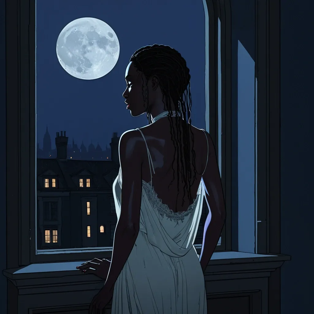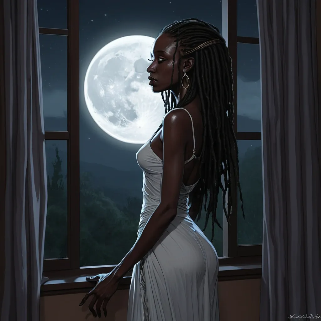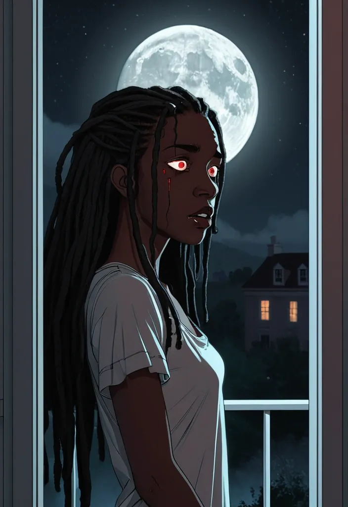 https://arthub.ai/post/22000d7f-3773-4fe9-a2a4-b98acd77fbcf Artstation , Illustration , Graphic Novel , "Generate an image representing longing for the chorus scene. The scene depicts her , a slender and graceful vampire in her late 20s to early 30s with dark skin , long dark dreadlocks , and naturally reddish eyes (without an intense glow) , looking out a window. Tears stream down her face as she gazes at the full moon from inside her room. She is wearing short , light clothing. It is a full moon night." , "Esbelta , elegante e graciosa (Slender , elegant , and graceful) , she possesses a timeless beauty that belies her true age. She appears to be in her late 20s to early 30s , with dark skin , long dark dreadlocks , and striking eyes that hold a captivating allure. Her eyes have a subtle reddish hue , a telltale sign of her vampiric nature , adding to her mystique. She carries herself with a quiet confidence and an air of sophistication , reflecting her long life and vast experiences. Her movements are fluid and graceful , like a dancer , and her presence commands attention without demanding it." ,