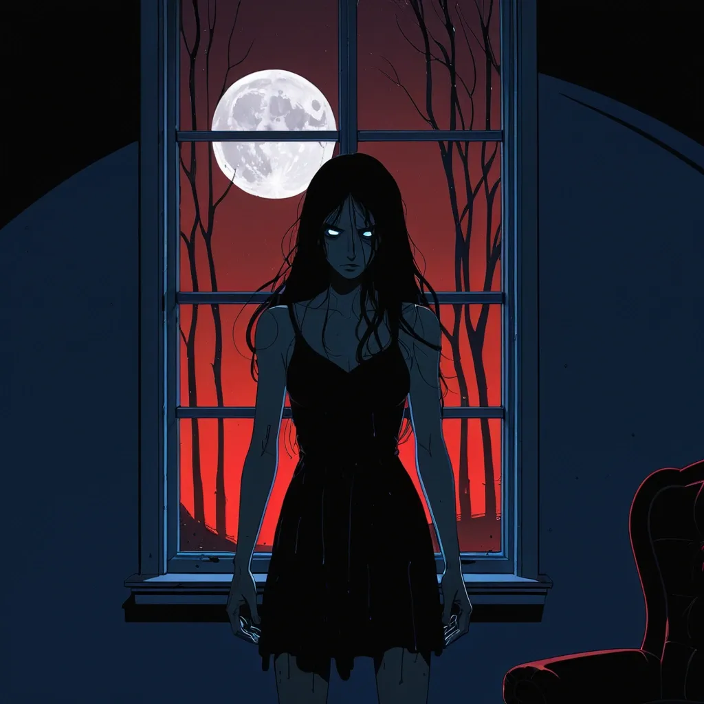 "A slender figure stands silhouetted against a window on a full moon night , tears tracing paths down their face. The scene is rendered in a graphic novel style , with bold lines and dramatic shadows. Moonlight spills into the room , illuminating the figure's long , dark hair. The figure's eyes hint at a deep , melancholic red. A short , light garment suggests vulnerability. The overall color palette is rich and saturated , with deep blues , purples , and reds dominating." ,