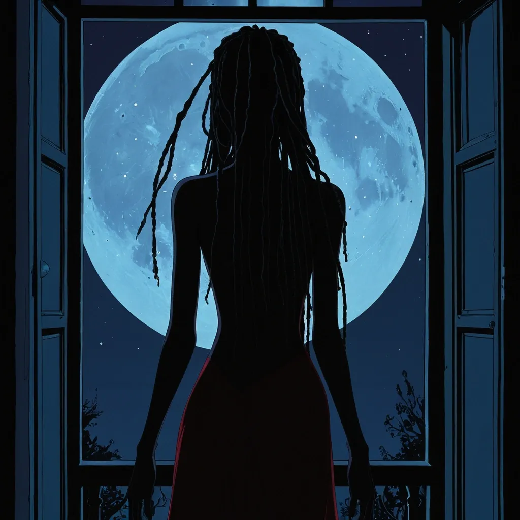 "A slender , graceful figure stands silhouetted against a window on a full moon night , tears tracing paths down her face. Her long , dark dreadlocks cascade down her back , partially obscuring her shoulders. The scene is rendered in a graphic novel style , with bold lines and dramatic shadows. The moonlight illuminates her dark skin , highlighting her elegant features. Her eyes , though shadowed , hint at a deep , melancholic red. The overall color palette is rich and saturated , with deep blues , purples , and reds dominating , creating a sense of longing and sorrow." ,
