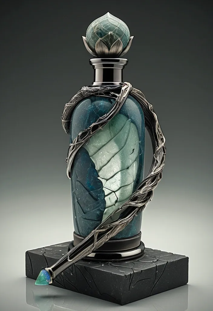 A hyper-detailed luxury men's fragrance bottle shaped like a lethal dagger. 1940s vintage comic , faded colors , the fragrance bottle label for “Reign of Petals”. The blade is razor-thin smoked sapphire glass , its surface etched with delicate frangipani petals that appear to float weightlessly inside. The hilt is matte black tungsten with a grip wrapped in fossilized lotus silk—textured like dragon scales. The crossguard is a single twisted vine of oxidized silver , cradling a single dew-covered blue lotus bloom at its center. The pommel is a spherical white meteorite , cracked to reveal glowing green watermelon rind quartz inside. The liquid is pale opal , shimmering with suspended musk particles. Rests on a slate plinth with shadowed floral engravings. Photorealistic , 8K , dark botanical elegance with violent precision. ,