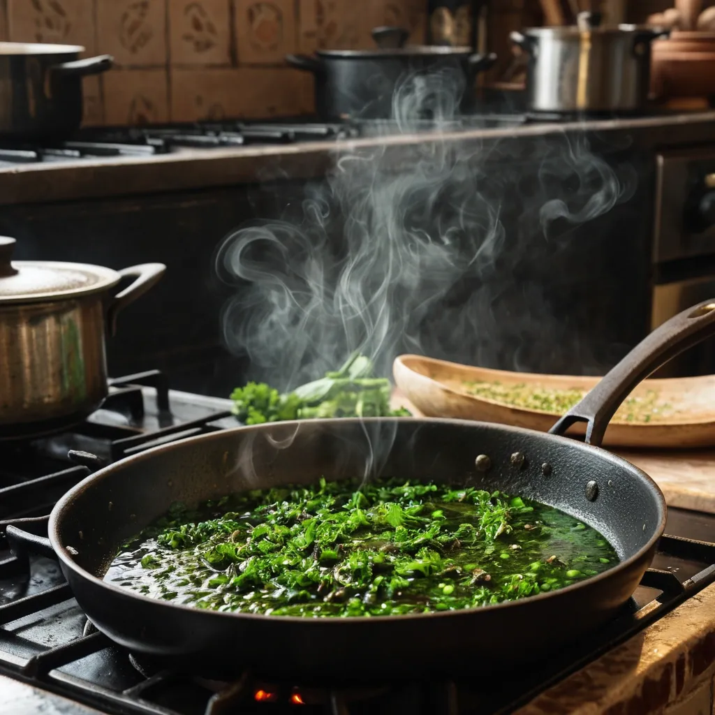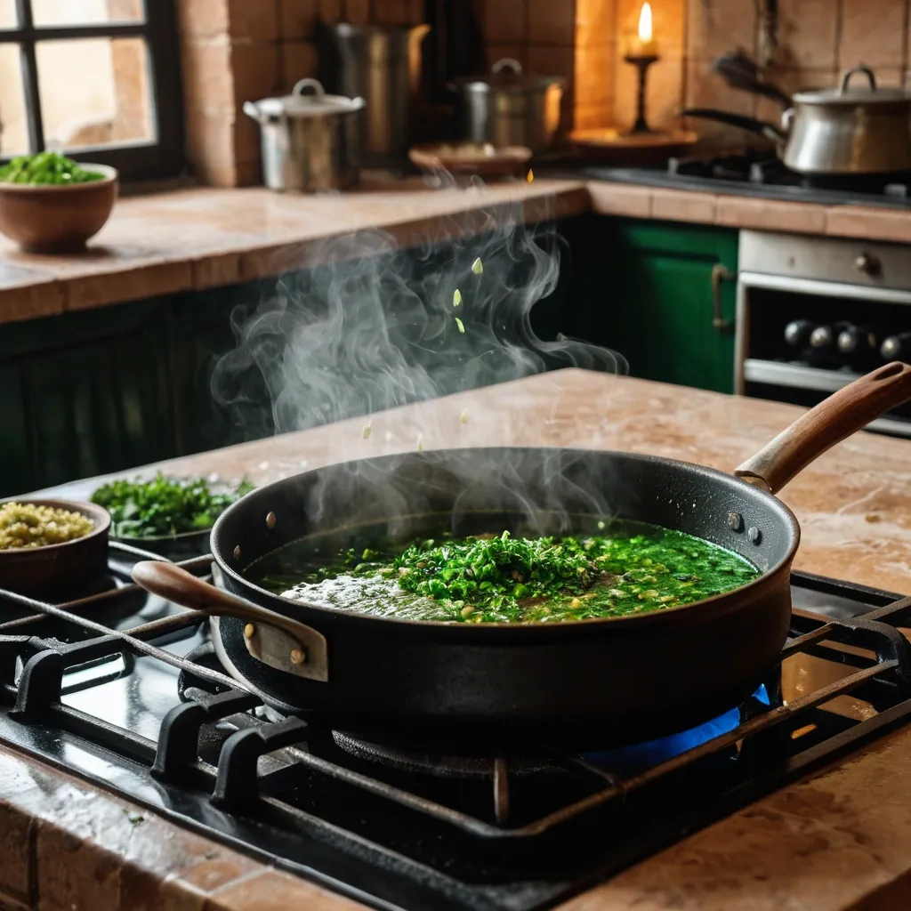 "A realistic high-quality food photography scene in a traditional Egyptian kitchen. In the background , a deep pot with molokhia is simmering gently on low heat for 10 minutes. In the foreground , a small frying pan is placed on a stove over medium heat with oil sizzling. Minced garlic is being stirred until it releases its aroma , and fresh green coriander is just added , being sautéed for a few seconds. Steam and aroma rise from the pan , creating an authentic warm cooking atmosphere with a rustic kitchen background and natural lighting." ,