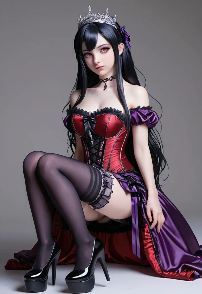 anime style illustration , adult woman (20+ years old) with mature feminine proportions , same character design as reference (long black hair , purple eyes , silver tiara , red gothic dress with black corset , mismatched thigh-high stockings , platform shoes with bows). Kneeling pose sitting on heels , legs folded under body , torso slightly turned and tilted , looking back over shoulder with playful and confident gaze. Elegant , charming smile with light blush , soft glowing skin , feminine curves and gentle posture. Warm studio lighting , soft shadows , detailed shading , clean background , masterpiece quality , high detail , artistic composition. ,