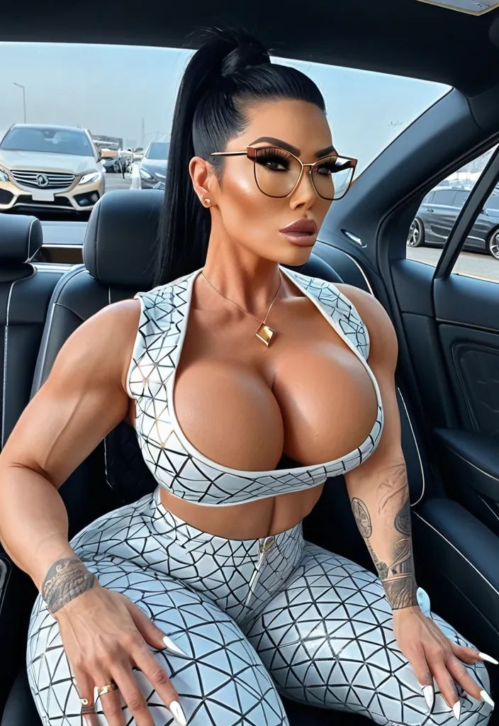 Generate Gorgeous female boss , bimbo , hourglass body , circle gold rimmed eye glasses , Japanese woman abnormally massive female bodybuilder , gorgeous , close up , full lips , big booty , black , pompadour up-do hair , feminine silhouette , too big breast , big booty , sexy thighs abs , silhouette , up close , flexing biceps , gorgeous brown eyes , legs are iconic and defining physical feature , both visually and in terms of combat ability.wearing an outfit that is a striking blend of elegance , power , and femininity , designed to command attention in any room. The suit is tailored to perfection , hugging the wearer’s curves with precision while emphasizing a structured silhouette. The fabric itself is a refined grey tweed patterned with subtle white grid lines , giving the suit a texture that feels both sophisticated and modern. The blazer features broad blue lapels and gold button accents , adding a luxurious touch that elevates the look beyond typical business attire. The matching high-waisted trousers elongate the frame , further enhancing the poised and commanding effect of the ensemble.The styling choices amplify the boldness of the suit. The inner blouse is a silky , greybutton-down shirt that complements the tweed’s tone while introducing a softer , feminine balance to the sharp tailoring of the jacket. The blouse peeks out neatly from under the blazer , maintaining elegance without drawing focus away from the suit’s commanding cut. Accessories are kept minimal yet intentional: a delicate layered gold necklace and hoop earrings that add glimmers of light and luxury without overpowering the outfit. The choice of voluminous , honey-brown braids cascading down her shoulders frames the face with both confidence and glamour , completing the commanding visual.Altogether , this look communicates a blend of authority and allure. It is business-ready yet fashion-forward , balancing corporate structure with vibrant femininity. The color palette blue , grey and gold avoids being overly delicate , instead embracing the richness of texture , structure , and presence. This is the kind of ensemble that speaks to ambition , sophistication , and personal style—ideal for someone who thrives in positions of influence but insists on expressing her individuality with bold elegance. It’s not just clothing—it’s a statement of power wrapped in grace. In luxury living legs that could crush a watermelon , skirt high boots are a bold and striking statement piece , crafted in glossy black patent leather that gives them a sleek , polished finish. Rising to just below the knee , the boots feature three adjustable buckle straps along the shaft , adding both edge and detail to their design. The towering stiletto heel , paired with a thick platform sole , creates an ultra-dramatic silhouette that elongates the leg and exudes power and confidence. With their combination of shine , height , and structure , these boots perfectly balance fierce femininity with high-fashion allure. Massive breast , massive cleavage , driving and sitting a car , wearing a blue , copper , and eggshell white colored geometric patterned t-shirt , blue denim pants , enormous butt ,