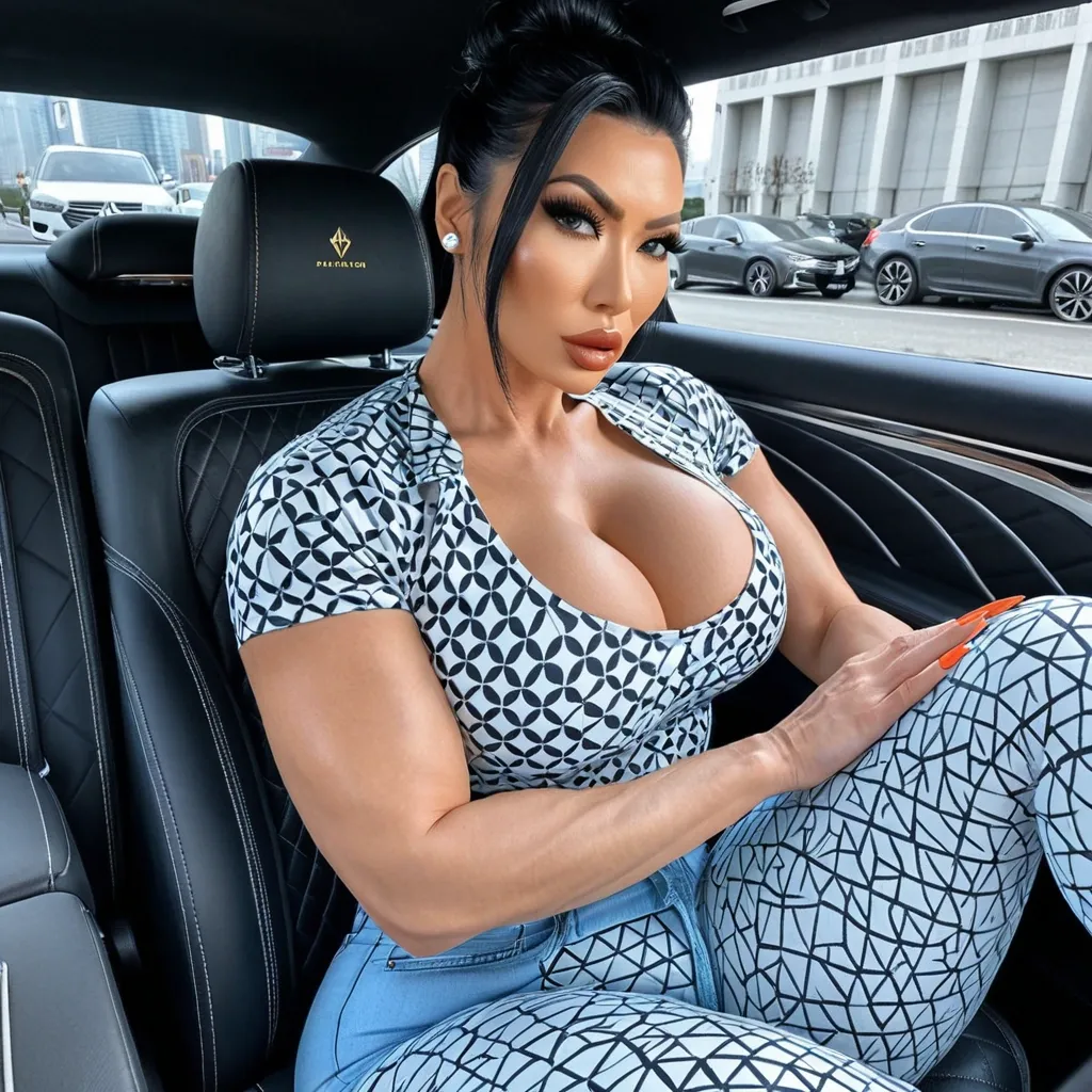 Generate Gorgeous female boss , bimbo , hourglass body , Japanese woman abnormally massive female bodybuilder , gorgeous , close up , full lips , big booty , black , pompadour up-do hair , feminine silhouette , too big breast , big booty , sexy thighs abs , silhouette , up close , flexing biceps , gorgeous brown eyes , legs are iconic and defining physical feature , both visually and in terms of combat ability.wearing an outfit that is a striking blend of elegance , power , and femininity , designed to command attention in any room. The suit is tailored to perfection , hugging the wearer’s curves with precision while emphasizing a structured silhouette. The fabric itself is a refined grey tweed patterned with subtle white grid lines , giving the suit a texture that feels both sophisticated and modern. The blazer features broad blue lapels and gold button accents , adding a luxurious touch that elevates the look beyond typical business attire. The matching high-waisted trousers elongate the frame , further enhancing the poised and commanding effect of the ensemble.The styling choices amplify the boldness of the suit. The inner blouse is a silky , greybutton-down shirt that complements the tweed’s tone while introducing a softer , feminine balance to the sharp tailoring of the jacket. The blouse peeks out neatly from under the blazer , maintaining elegance without drawing focus away from the suit’s commanding cut. Accessories are kept minimal yet intentional: a delicate layered gold necklace and hoop earrings that add glimmers of light and luxury without overpowering the outfit. The choice of voluminous , honey-brown braids cascading down her shoulders frames the face with both confidence and glamour , completing the commanding visual.Altogether , this look communicates a blend of authority and allure. It is business-ready yet fashion-forward , balancing corporate structure with vibrant femininity. The color palette blue , grey and gold avoids being overly delicate , instead embracing the richness of texture , structure , and presence. This is the kind of ensemble that speaks to ambition , sophistication , and personal style—ideal for someone who thrives in positions of influence but insists on expressing her individuality with bold elegance. It’s not just clothing—it’s a statement of power wrapped in grace. In luxury living legs that could crush a watermelon , skirt high boots are a bold and striking statement piece , crafted in glossy black patent leather that gives them a sleek , polished finish. Rising to just below the knee , the boots feature three adjustable buckle straps along the shaft , adding both edge and detail to their design. The towering stiletto heel , paired with a thick platform sole , creates an ultra-dramatic silhouette that elongates the leg and exudes power and confidence. With their combination of shine , height , and structure , these boots perfectly balance fierce femininity with high-fashion allure. Massive breast , massive cleavage , driving and sitting a car , wearing a blue , copper , and eggshell white colored geometric patterned t-shirt , blue denim pants , enormous butt ,