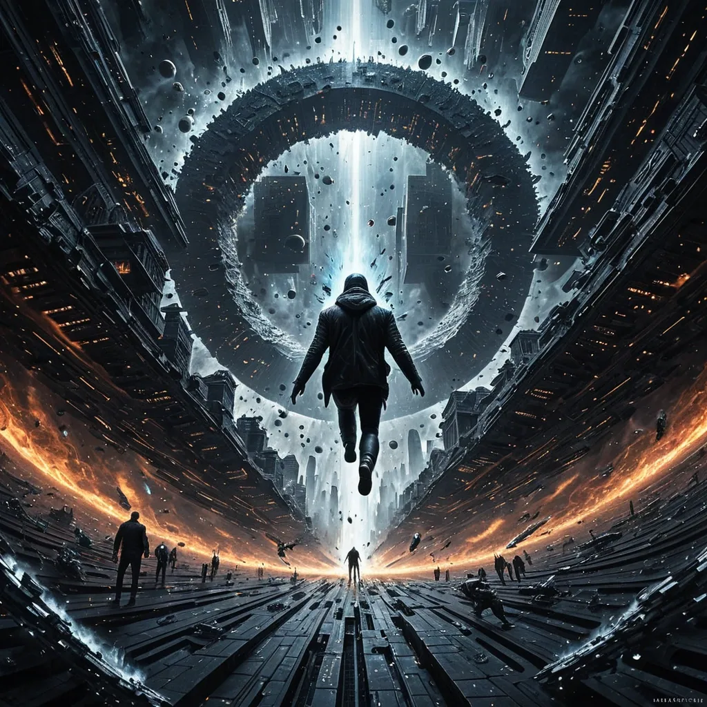 The Gravity Well urban scale emerging from darkness. A civilization in motion , cities expanding , structured acceleration , people flying through space. The figure is small against the scale of the void , but positioned like they fly there deliberately. Not falling. flying at the threshold. The black hole isn't rendered as destruction. Style: deeply spiritual sci-fi art , reminiscent of digital hyperrealism combined with cosmic impressionism. Focus on intricate detail of light and smoke flow. ,