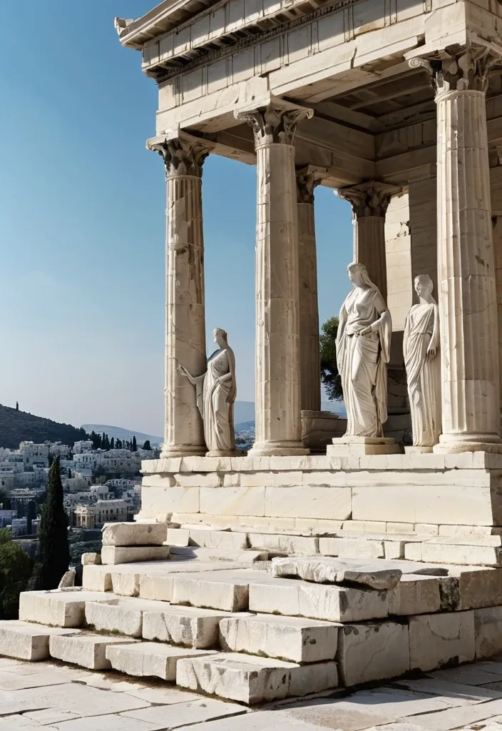 Erechtheion , Athens — 250 BCE Standing at eye level on the Acropolis during a bright , clear late-spring morning , the Erechtheion rises in elegant asymmetry on its uneven limestone terrace. The sacred olive tree of Athena spreads its silvery-green leaves beside the temple , its branches stirring in a gentle breeze that carries the scent of warm stone. The Porch of the Caryatids commands attention: six sculpted maidens in flowing drapery , their forms both graceful and solemn , supporting the entablature with effortless poise. Visitors—Athenian citizens , priests , and travelers—move quietly along the marble steps , some offering small tokens at the shrine while others admire the intricate friezes. Beyond them , the blue Aegean glimmers far below. Style: Matte Painting , detailed and atmospheric , Eye-level view , Full scene , 4K ,