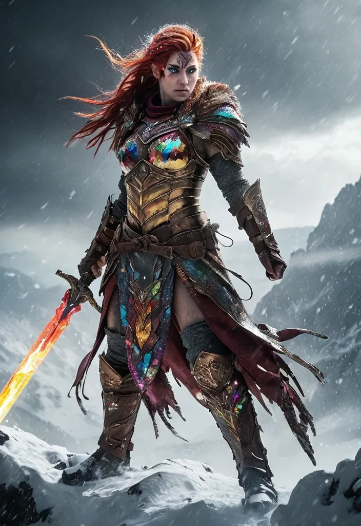 A fierce warrior woman appearing as a crystalline skin , rainbow colors and flowers with braided red hair , clad in cracked bronze armor and a fur-lined cape , stands atop a snow-covered mountain ridge as a blizzard howls around her; she unsheathes a massive glowing sword , its runes pulsing with crystalline and charges forward into the storm with determined eyes; the camera tracks her from behind in a dynamic follow shot , snow whipping past the lens , rim light accentuating the sharp angles of her silhouette against the storm; dramatic epic fantasy style with high contrast , wind-driven motion blur , and sweeping orchestral tension ,