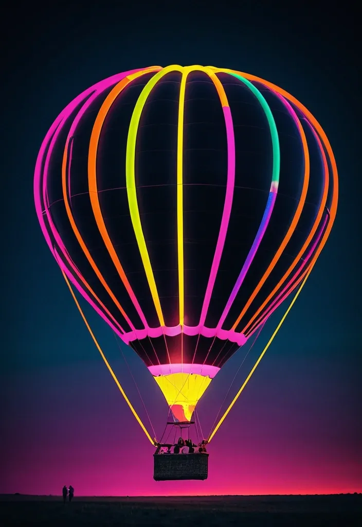 Panopticon Octavio Ocampo: create an artistic image of hot air balloons float serenely across a clear blue sky caught in a gentle breeze , swirling and dancing in the air. As they move , the balloons are forming the silhouette of a beautiful man. The figure should be composed entirely of these vibrant balloons to give the impression that he is both part of the wind and made by it. The background should be a soft , out-of-focus scene that suggests a serene urban setting , subtly hinting at the contrast between the natural beauty of the balloons and the man-made environment ,