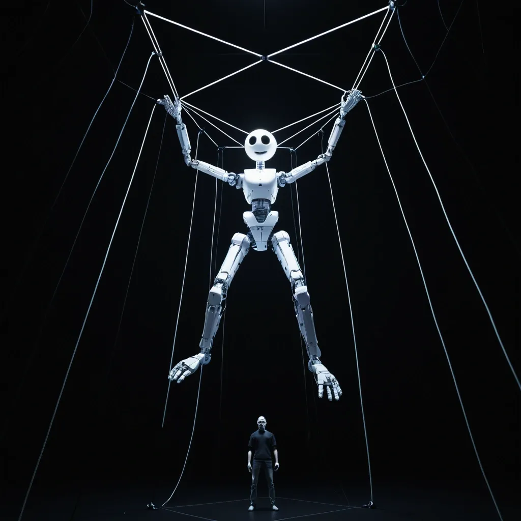 Ángulo: contrapicado leve (para enfatizar dominación) Encuadre: plano entero Iluminación: luz cenital (desde arriba → control) Composición: IA arriba , persona abajo figura humana como marioneta con hilos conectados a una red digital de inteligencia artificial , fondo oscuro , iluminación cenital , estilo conceptual , alto contraste ,