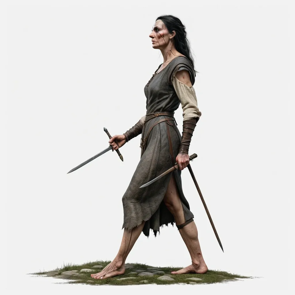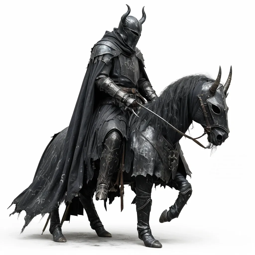 The Phantom Captain (Hellequin) , spectral medieval rider in tattered black armor with a horned helm and flowing cloak , Style: hyperrealistic with a painterly texture , reminiscent of historical reconstruction art , detailed and atmospheric , Full body , Leather boots , Side View , 4K , White or Transparent Background. ,