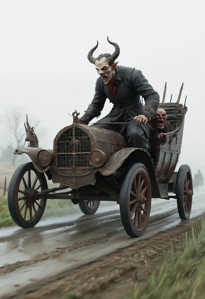 Demons (as drivers of the household) , supernatural forces guiding the restless dead across the countryside during the infernal chase , Style: hyperrealistic with a painterly texture , reminiscent of historical reconstruction art , detailed and atmospheric with subtle depth of field , White Background or Transparent , Full body shot , Side View , 4K. ,