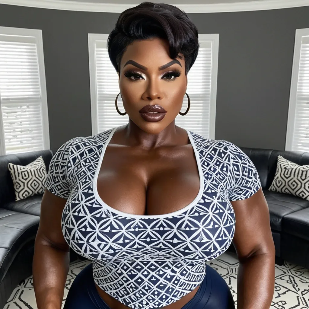 Generate Gorgeous female boss , bimbo , very dark-skinned African-American woman , short , pixie hair , hourglass body , abnormally massive female bodybuilder , gorgeous , close up , full lips , big booty , dark brown eyes , very big plump lips , feminine silhouette , too big breast , big booty , sexy thighs abs , silhouette , up close , flexing biceps , big gorgeous light brown eyes , legs are iconic and defining physical feature , both visually and in terms of combat ability.wearing an outfit that is a striking blend of elegance , power , and femininity , designed to command attention in any room. The suit is tailored to perfection , hugging the wearer’s curves with precision while emphasizing a structured silhouette. The fabric itself is a refined grey tweed patterned with subtle white grid lines , giving the suit a texture that feels both sophisticated and modern. The blazer features broad blue lapels and gold button accents , adding a luxurious touch that elevates the look beyond typical business attire. The matching high-waisted trousers elongate the frame , further enhancing the poised and commanding effect of the ensemble.The styling choices amplify the boldness of the suit. The inner blouse is a silky , greybutton-down shirt that complements the tweed’s tone while introducing a softer , feminine balance to the sharp tailoring of the jacket. The blouse peeks out neatly from under the blazer , maintaining elegance without drawing focus away from the suit’s commanding cut. Accessories are kept minimal yet intentional: a delicate layered gold necklace and hoop earrings that add glimmers of light and luxury without overpowering the outfit. The choice of voluminous , honey-brown braids cascading down her shoulders frames the face with both confidence and glamour , completing the commanding visual.Altogether , this look communicates a blend of authority and allure. It is business-ready yet fashion-forward , balancing corporate structure with vibrant femininity. The color palette blue , grey and gold avoids being overly delicate , instead embracing the richness of texture , structure , and presence. This is the kind of ensemble that speaks to ambition , sophistication , and personal style—ideal for someone who thrives in positions of influence but insists on expressing her individuality with bold elegance. It’s not just clothing—it’s a statement of power wrapped in grace. In luxury living legs that could crush a watermelon , skirt high boots are a bold and striking statement piece , crafted in glossy black patent leather that gives them a sleek , polished finish. Rising to just below the knee , the boots feature three adjustable buckle straps along the shaft , adding both edge and detail to their design. The towering stiletto heel , paired with a thick platform sole , creates an ultra-dramatic silhouette that elongates the leg and exudes power and confidence. With their combination of shine , height , and structure , these boots perfectly balance fierce femininity with high-fashion allure. Massive breast , massive cleavage , driving and standing in living room , short fingernails wearing a white , dark navy blue and black accented subtle symmetrical patterned t-shirt , black denim pants , enormous butt ,