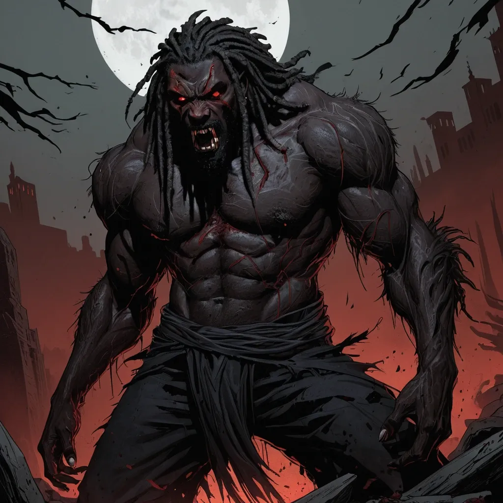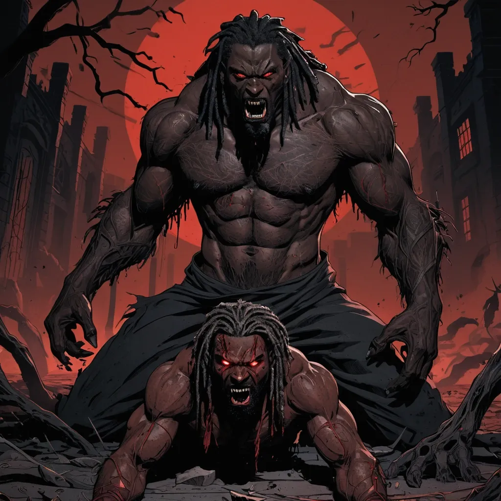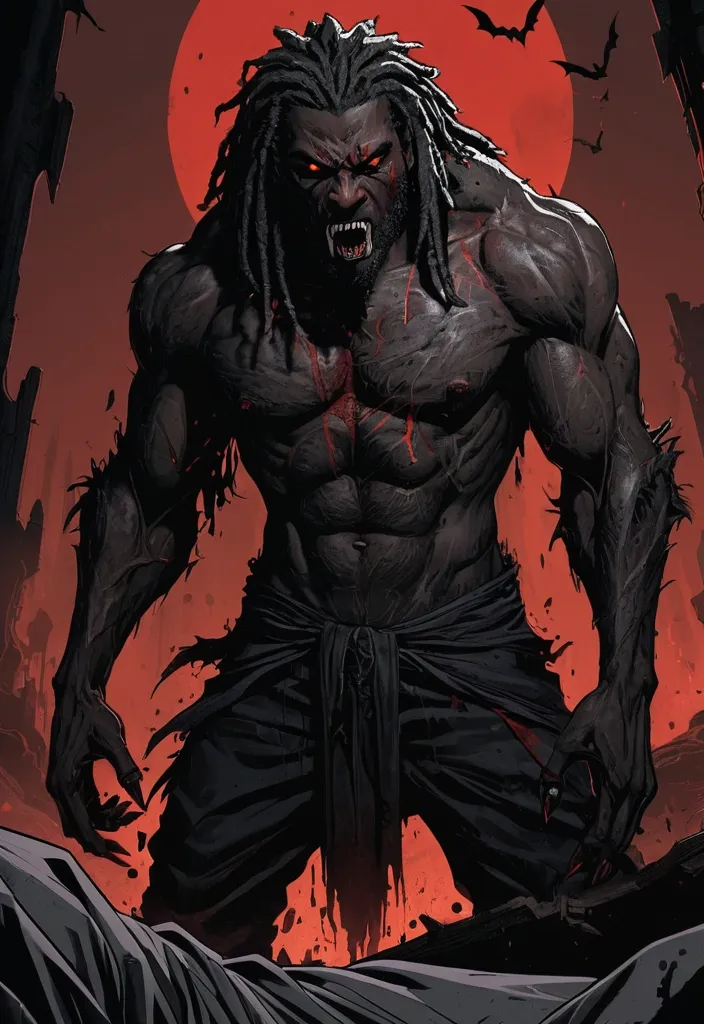 A strong , imposing werewolf with dark skin , dreadlocks , and wolf-like eyes stands over a fallen vampire , who is slowly turning to ash. This illustration is rendered in a graphic novel style , with bold lines and dramatic shadows , reminiscent of Artstation illustrations. His clothes are torn , his fangs bared , and his eyes burn with intense hatred. The vampire's form crumbles into dust , symbolizing the finality of his defeat. The overall color palette is dark and vengeful , with deep reds , blacks , and grays dominating , emphasizing the werewolf's fury and the vampire's demise. ,
