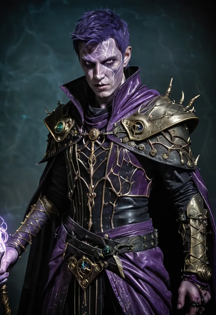 Role: Chaotic support. His magic is as unpredictable as his own nature. Appearance: Leaner and androgynous. His eyes have a mad glint or a chaotic shimmer of various colors. "Magic scars"—glowing veins of unstable energy—are visible on his skin (often on his face and hands). Armor/Robe: Luxurious but tattered clothing. A velvet cloak with faded patterns , beneath which is a leather corset/vest with bone inlays. Numerous amulets , rings , and bracelets , each seeming to contain its own essence , shimmer and glow chaotically. One arm may be wrapped in occult bandages that emit a dim light. Colors: deep purple , dark gold , poisonous green , black. Weapon: "Staff of Chaotic Principles" This is not a staff , but a wand or short scepter that can be held in one hand while the other sorcerer makes chaotic gestures. Handle: Bone or ebony , wrapped in wire of various metals. ,