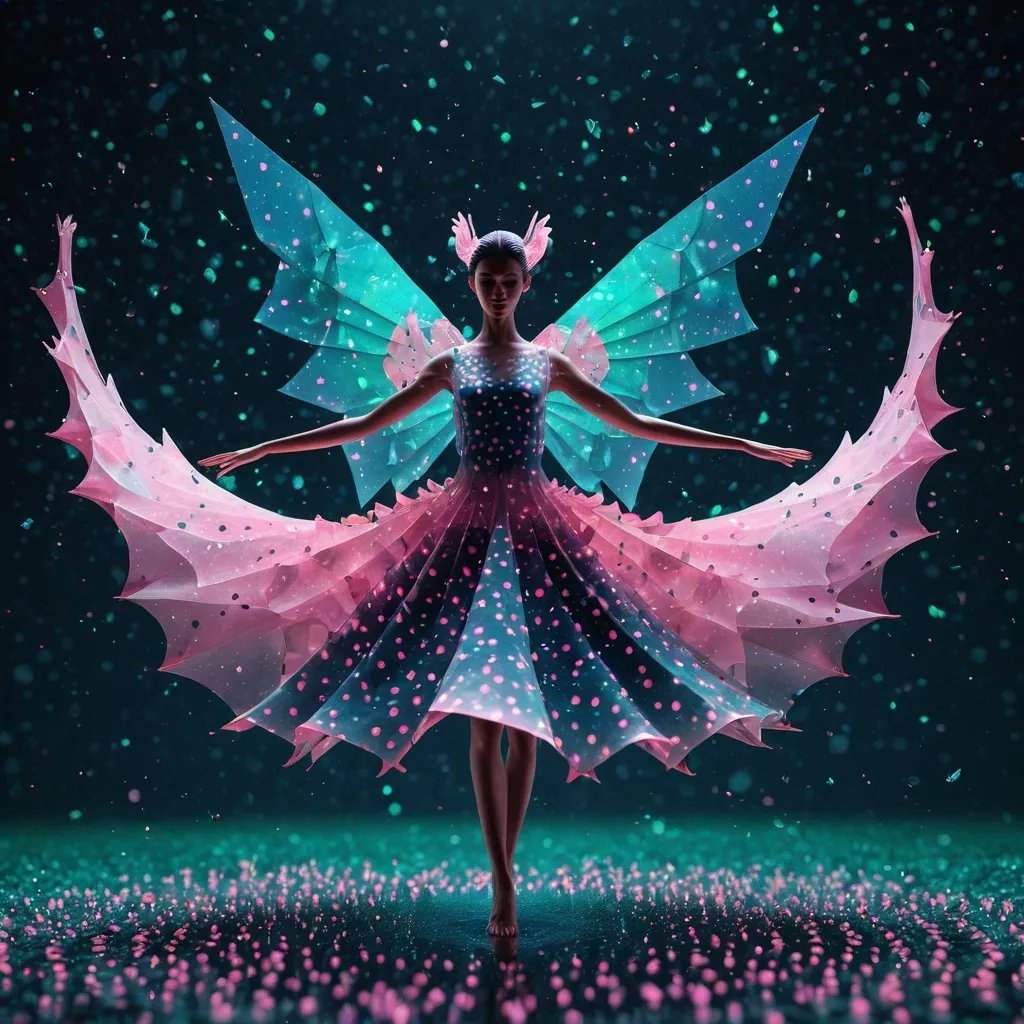 Creative Origami flamenco dancer resembling with wings-like in vortex , (3D rendering:1.1) Surreal composed of (translucent polygon and fauna particles surreal into the dark sky:1.1) , with a smaller flow , lighter (blue and green particle formation behind it diminishing in size:1.0) , a dress rendered in (pink dots reflecting on calm , reflective ground:1.2) , extending from the base of the bioluminescent auditorium into the foreground. The air shimmers with magical energy , and the scene pulses with gentle light. ,