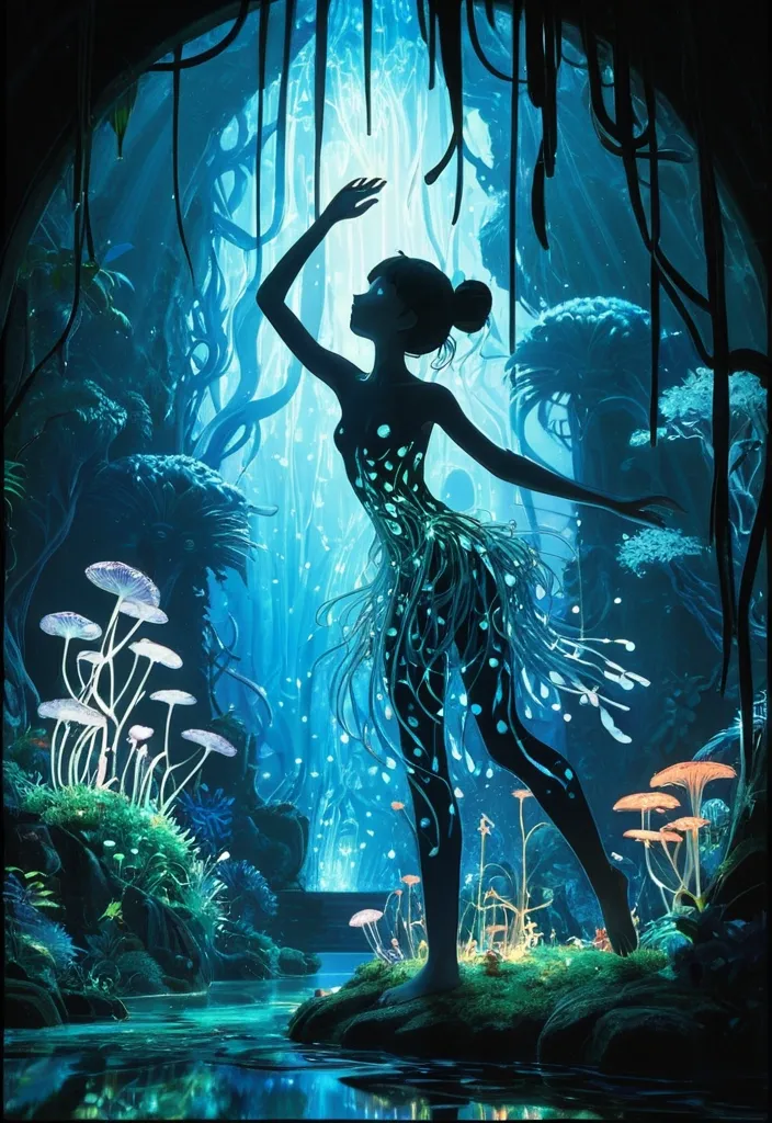 A dancer's silhouette is formed by a cascade of bioluminescent flora and fauna , creating a living , breathing sculpture against a backdrop of a bioluminescent jungle. The air shimmers with magical energy , and the scene pulses with gentle light. This prompt is inspired by the vibrant , organic forms found in the art of Ernst Haeckel and the magical realism of Studio Ghibli films. ,