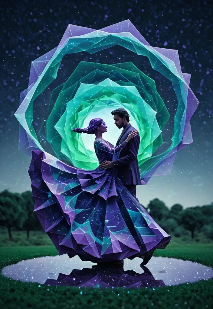 Creative Origami flamenco dancer couple resembling with dupatta-like in vortex towards sky , (3D rendering:1.1) Surreal composed of (translucent polygon and fauna particles surreal into the dark sky:1.1) , with a smaller flow , lighter (blue and green particle formation behind it diminishing in size:1.0) , a dress rendered in (purple lines reflecting on calm , reflective ground:1.2) , extending from the base of the bioluminescent forest into the foreground. The air shimmers with magical energy , and the scene pulses with gentle light. ,