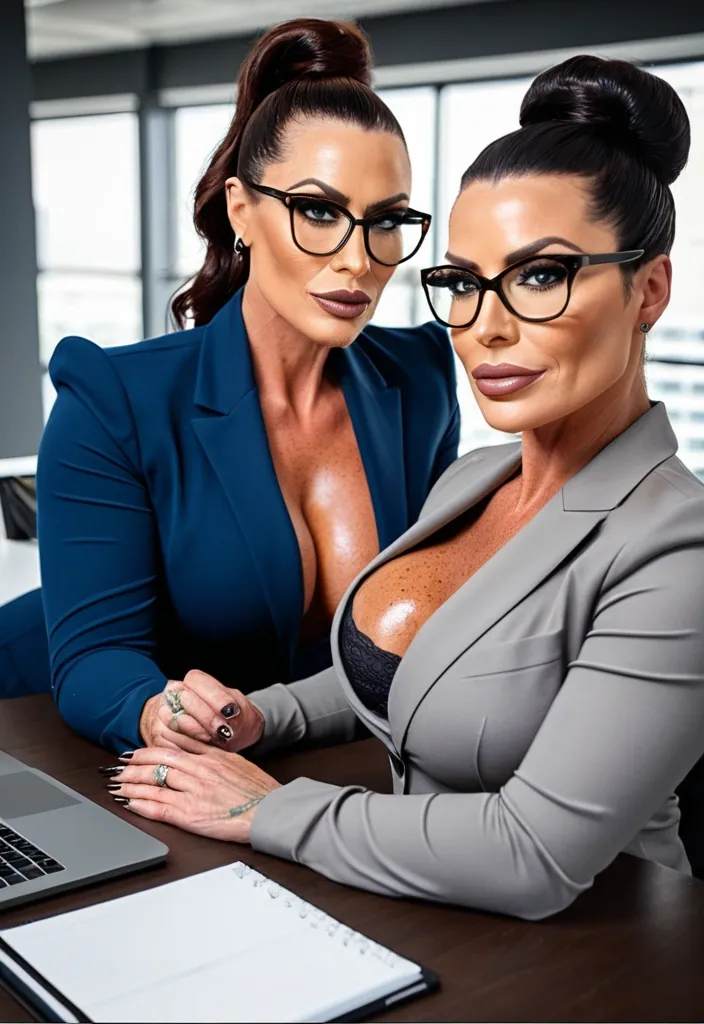 Generate Gorgeous 38 years old , female boss , Caucasian woman , bimbo , hourglass body , abnormally massive female bodybuilder , gorgeous , close up , full lips , big booty , brunette , freckles eye glasses , updo hair , one curl coming down on forehead slick back , shaved on the side , , , feminine silhouette , too big breast , big booty , sexy thighs abs , silhouette , up close , flexing biceps , beautiful brown eyes , legs are iconic and defining physical feature , both visually and in terms of combat ability.wearing an outfit that is a striking blend of elegance , power , and femininity , designed to command attention in any room. The suit is tailored to perfection , hugging the wearer’s curves with precision while emphasizing a structured silhouette. The fabric itself is a refined grey tweed patterned with subtle white grid lines , giving the suit a texture that feels both sophisticated and modern. The blazer features broad blue lapels and gold button accents , adding a luxurious touch that elevates the look beyond typical business attire. The matching high-waisted trousers elongate the frame , further enhancing the poised and commanding effect of the ensemble.The styling choices amplify the boldness of the suit. The inner blouse is a silky , greybutton-down shirt that complements the tweed’s tone while introducing a softer , feminine balance to the sharp tailoring of the jacket. The blouse peeks out neatly from under the blazer , maintaining elegance without drawing focus away from the suit’s commanding cut. Accessories are kept minimal yet intentional: a delicate layered gold necklace and hoop earrings that add glimmers of light and luxury without overpowering the outfit. The choice of voluminous , honey-brown braids cascading down her shoulders frames the face with both confidence and glamour , completing the commanding visual.Altogether , this look communicates a blend of authority and allure. It is business-ready yet fashion-forward , balancing corporate structure with vibrant femininity. The color palette blue , grey and gold avoids being overly delicate , instead embracing the richness of texture , structure , and presence. This is the kind of ensemble that speaks to ambition , sophistication , and personal style—ideal for someone who thrives in positions of influence but insists on expressing her individuality with bold elegance. It’s not just clothing—it’s a statement of power wrapped in grace. In luxury living legs that could crush a watermelon , skirt high boots are a bold and striking statement piece , crafted in glossy black patent leather that gives them a sleek , polished finish. Rising to just below the knee , the boots feature three adjustable buckle straps along the shaft , adding both edge and detail to their design. The towering stiletto heel , paired with a thick platform sole , creates an ultra-dramatic silhouette that elongates the leg and exudes power and confidence. With their combination of shine , height , and structure , these boots perfectly balance fierce femininity with high-fashion allure. High cheekbones , prominent jawline , gorgeous big brown eyes , freckles , enormous breast , gray hand under the table , gorgeous brown eyes , enormous butt , enormous breast sitting at desk in chaur , black oxford shirt , beige skirt , sittjng next to handsome African American man in blue oxford t-shirt , and black pants ,