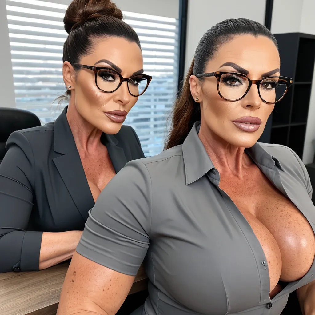 Generate Gorgeous 38 years old , female boss , Caucasian woman , bimbo , hourglass body , abnormally massive female bodybuilder , gorgeous , close up , full lips , big booty , brunette , freckles eye glasses , updo hair , one curl coming down on forehead slick back , shaved on the side , , , feminine silhouette , too big breast , big booty , sexy thighs abs , silhouette , up close , flexing biceps , beautiful brown eyes , legs are iconic and defining physical feature , both visually and in terms of combat ability.wearing an outfit that is a striking blend of elegance , power , and femininity , designed to command attention in any room. The suit is tailored to perfection , hugging the wearer’s curves with precision while emphasizing a structured silhouette. The fabric itself is a refined grey tweed patterned with subtle white grid lines , giving the suit a texture that feels both sophisticated and modern. The blazer features broad blue lapels and gold button accents , adding a luxurious touch that elevates the look beyond typical business attire. The matching high-waisted trousers elongate the frame , further enhancing the poised and commanding effect of the ensemble.The styling choices amplify the boldness of the suit. The inner blouse is a silky , greybutton-down shirt that complements the tweed’s tone while introducing a softer , feminine balance to the sharp tailoring of the jacket. The blouse peeks out neatly from under the blazer , maintaining elegance without drawing focus away from the suit’s commanding cut. Accessories are kept minimal yet intentional: a delicate layered gold necklace and hoop earrings that add glimmers of light and luxury without overpowering the outfit. The choice of voluminous , honey-brown braids cascading down her shoulders frames the face with both confidence and glamour , completing the commanding visual.Altogether , this look communicates a blend of authority and allure. It is business-ready yet fashion-forward , balancing corporate structure with vibrant femininity. The color palette blue , grey and gold avoids being overly delicate , instead embracing the richness of texture , structure , and presence. This is the kind of ensemble that speaks to ambition , sophistication , and personal style—ideal for someone who thrives in positions of influence but insists on expressing her individuality with bold elegance. It’s not just clothing—it’s a statement of power wrapped in grace. In luxury living legs that could crush a watermelon , skirt high boots are a bold and striking statement piece , crafted in glossy black patent leather that gives them a sleek , polished finish. Rising to just below the knee , the boots feature three adjustable buckle straps along the shaft , adding both edge and detail to their design. The towering stiletto heel , paired with a thick platform sole , creates an ultra-dramatic silhouette that elongates the leg and exudes power and confidence. With their combination of shine , height , and structure , these boots perfectly balance fierce femininity with high-fashion allure. High cheekbones , prominent jawline , gorgeous big brown eyes , freckles , enormous breast , gray drinking coffee , gorgeous brown eyes , enormous butt , enormous breast sitting at desk in chaur , black oxford shirt , beige skirt , sittjng next to handsome dark-skinned African American man in blue oxford t-shirt , and black pants ,